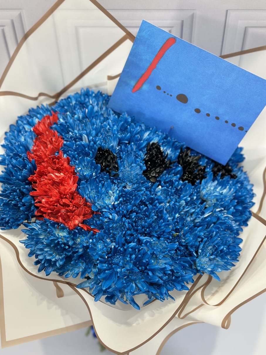 Hermoso bouquet inspirado en la famosa obra de Joan Miró inmersión azul , incluye tarjeta con mensaje personalizado y foto de la obra de arte.