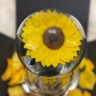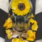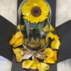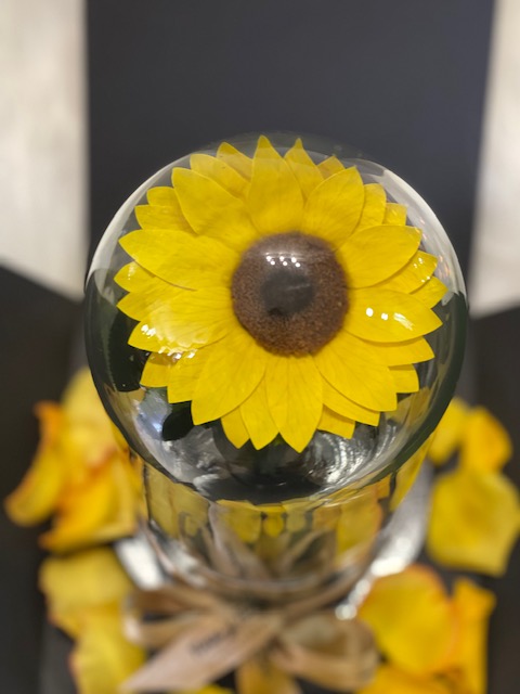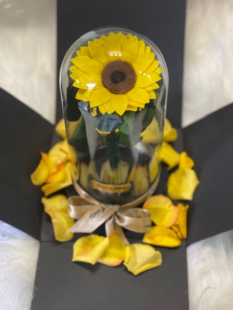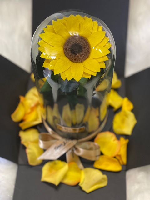 Beautiful preserved sunflower in a glass urn and wooden base, with LED lights, packaged in a luxury box and natural rose petals. Lasts for over two years. Includes a card with a personalized message.