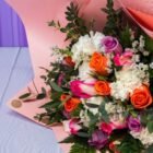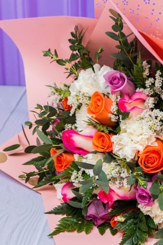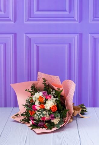 A beautiful bouquet with a mix of seasonal flowers, such as roses, carnations, statis, and various foliage, wrapped in imported paper, perfect for surprising. Includes a card with a personalized message.