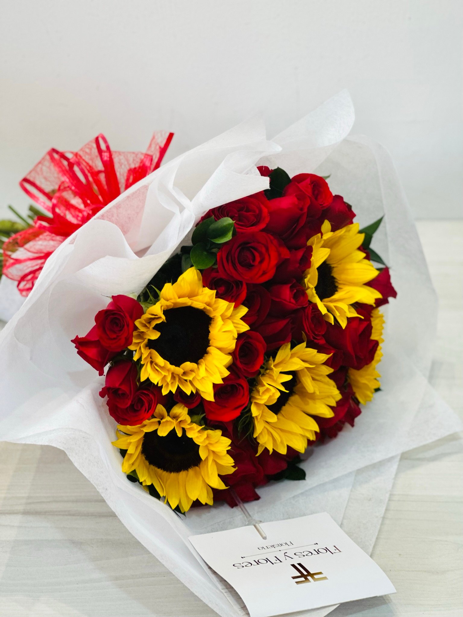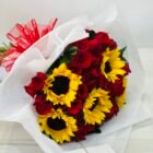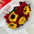 Bouquet composed of 5 sunflowers and 40 red roses, wrapped in special fabric, includes a message that you can personalize.