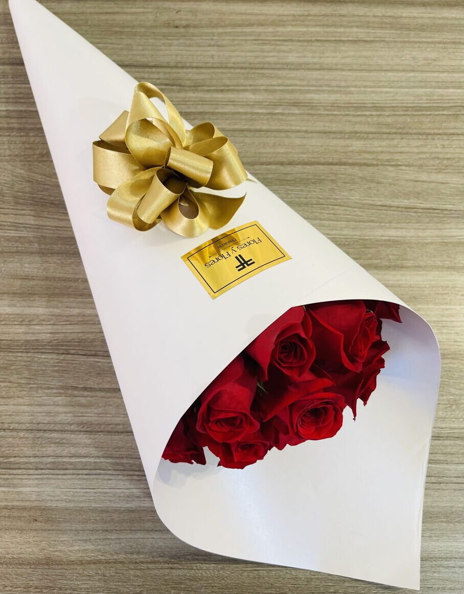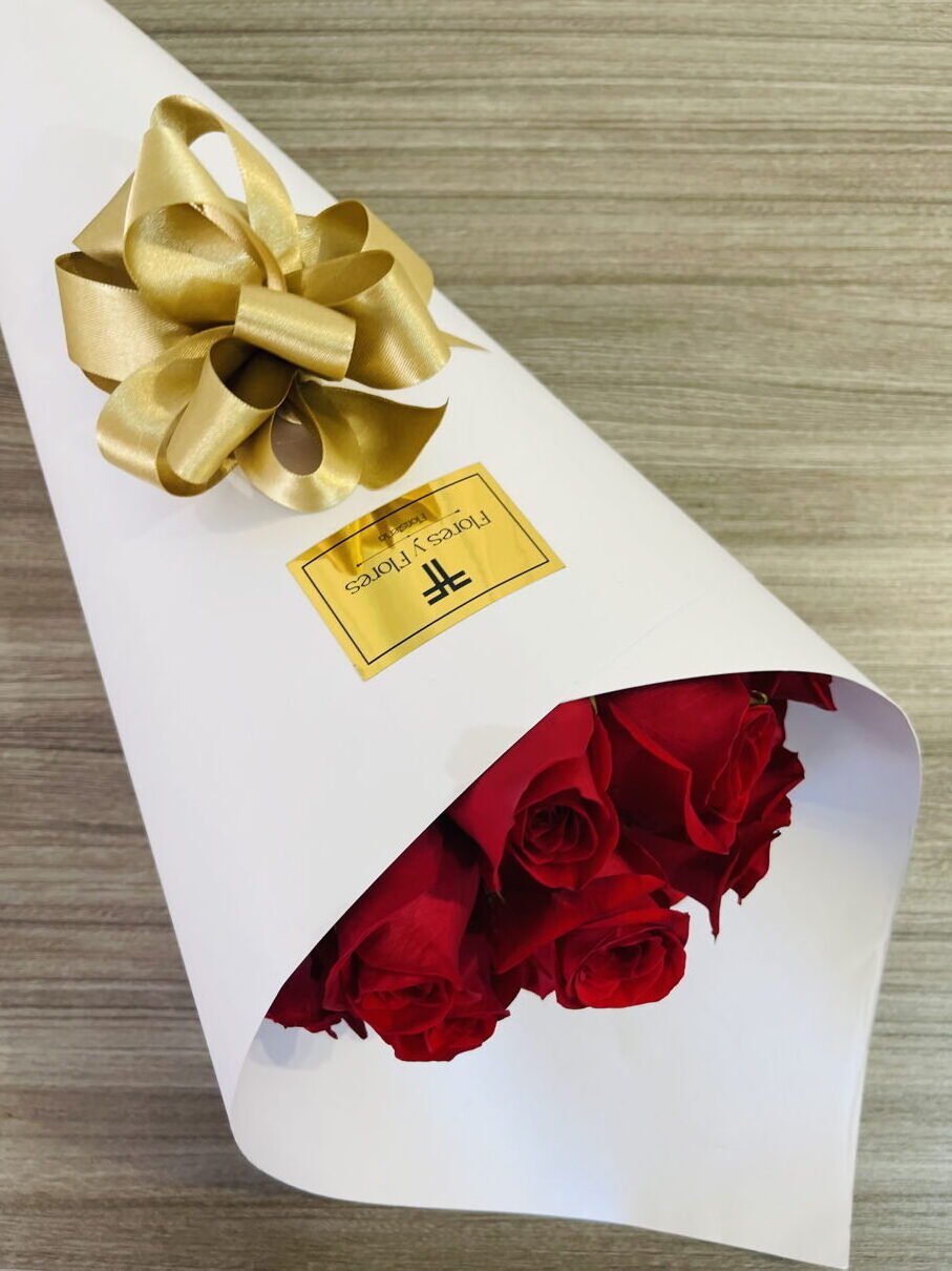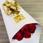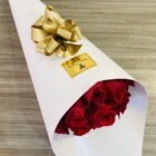 Beautiful bouquet of 18 red roses wrapped in luxury paper, includes a card that you can personalize.