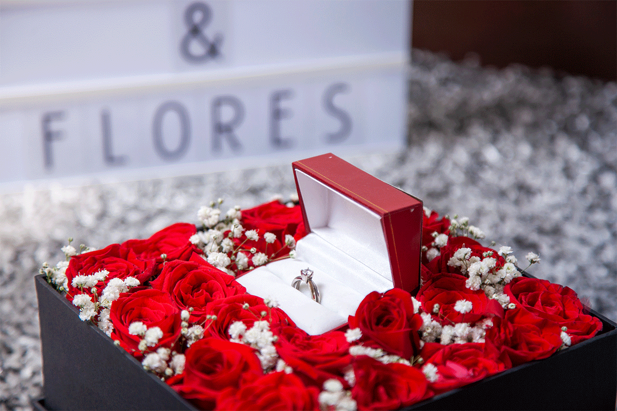 Floral arrangement in a square box with roses, ideal for a beautiful marriage proposal. Includes a card with a personalized message. We’re your partners in your best moments. Ring not included; you can exchange the item for any other you wish.