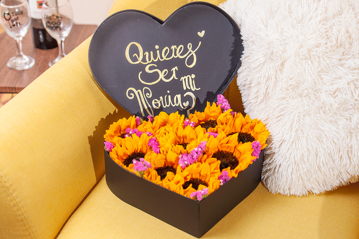 Make your proposal something very special, with this beautiful heart-shaped box of sunflowers and statis personalized with the message you want.