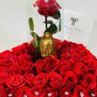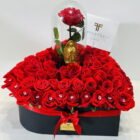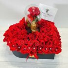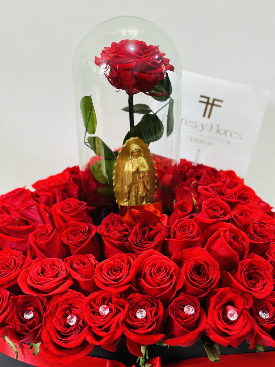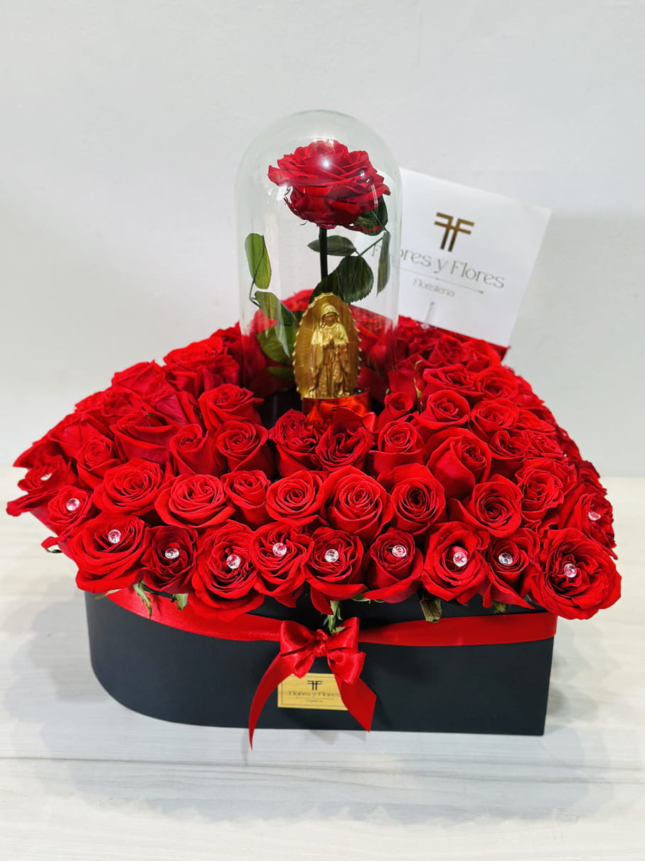 A beautiful large heart with more than 100 red roses, decorated with beautiful gems, includes a premium preserved rose that lasts more than two years and the Virgin of Guadalupe, a beautiful combination. The floral arrangement includes a message that you can personalize.