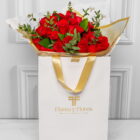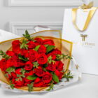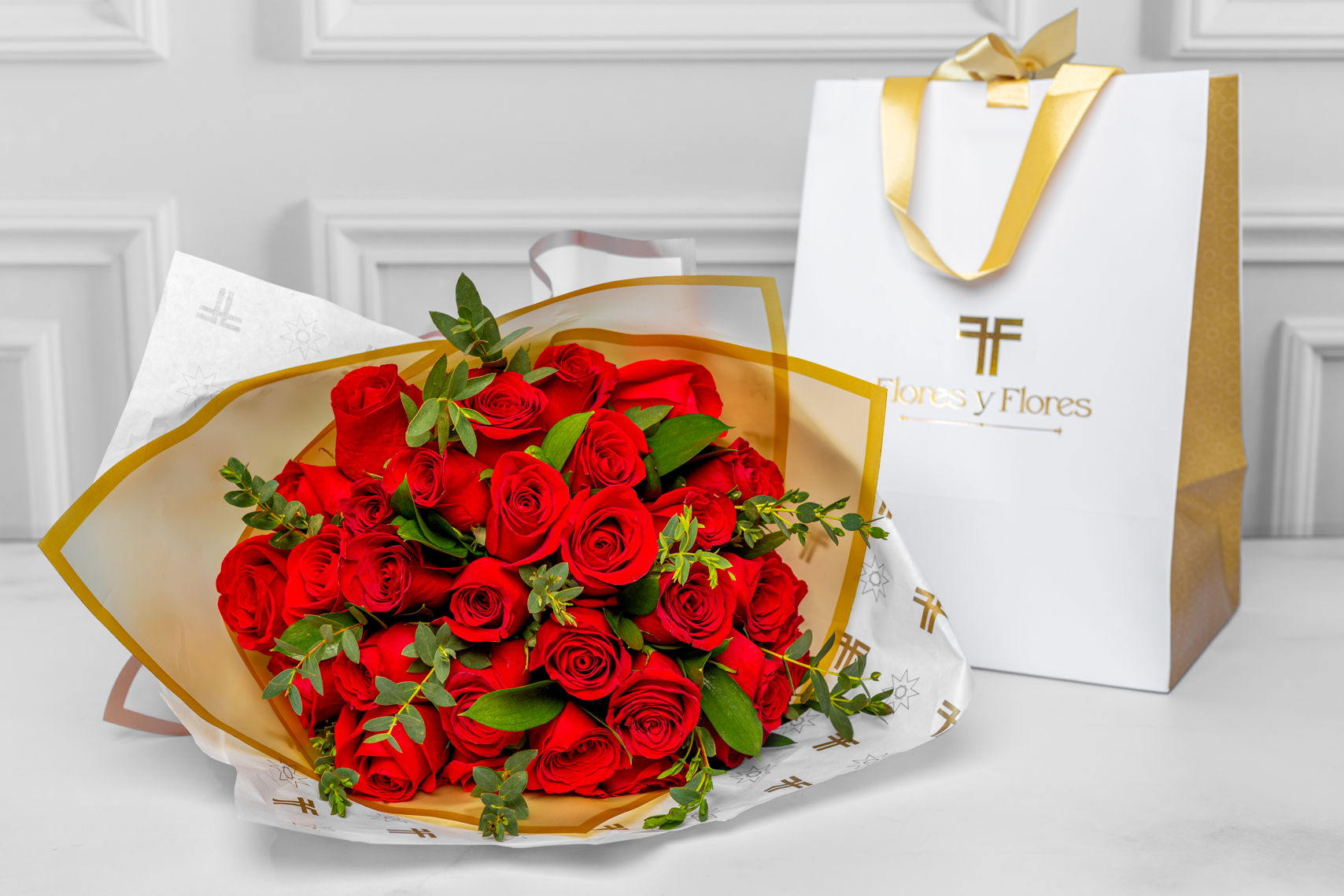 A beautiful bouquet of 36 red roses with seasonal foliage, wrapped in imported paper. This elegant bouquet comes in a luxury bag and includes a card with a personalized message.
