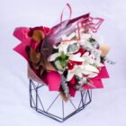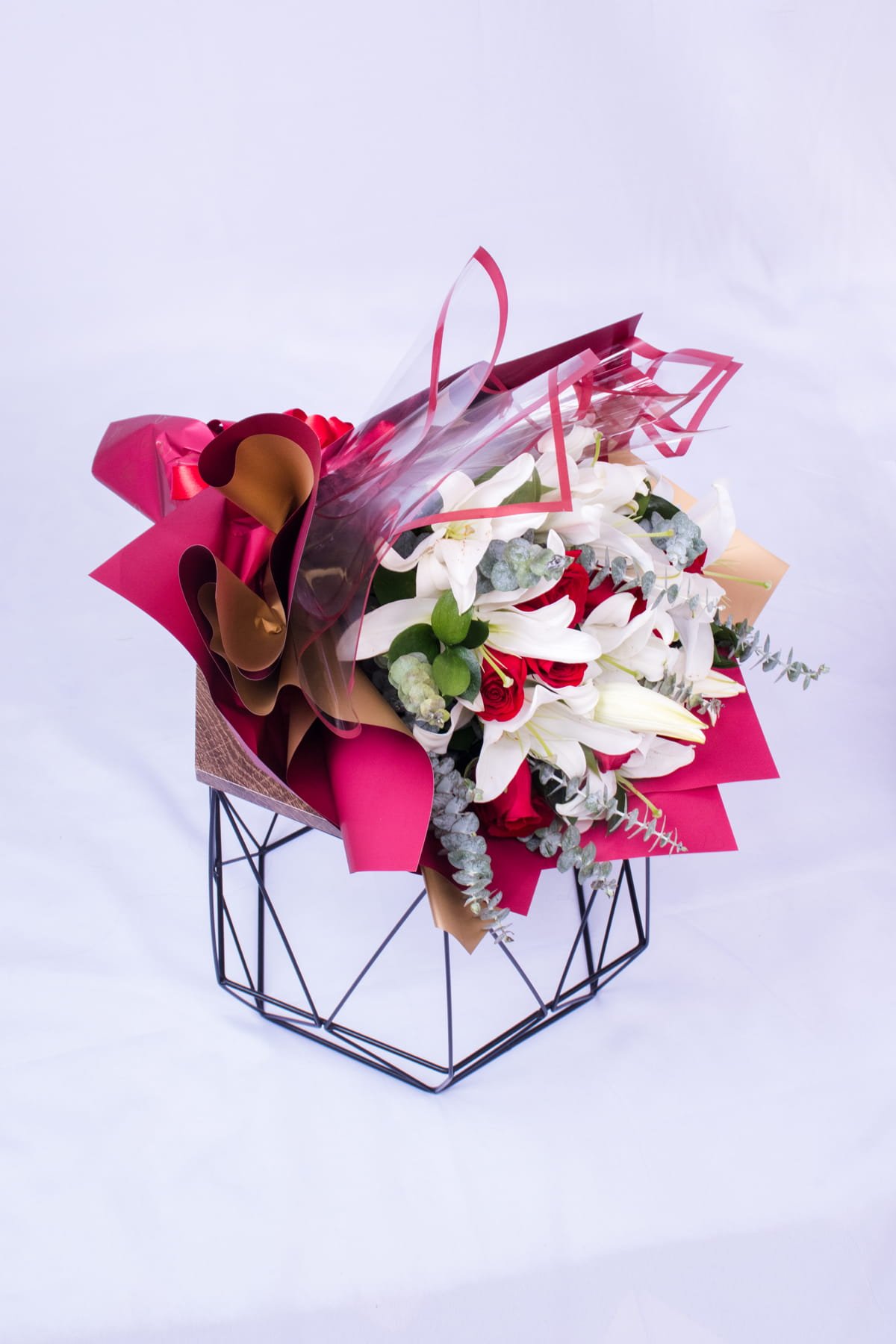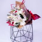 Beautiful bouquet containing 8 lily stems and 18 red roses, wrapped in beautiful Korean papers, includes a card with a message that you can personalize.