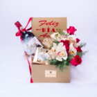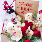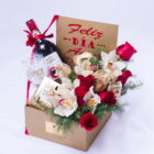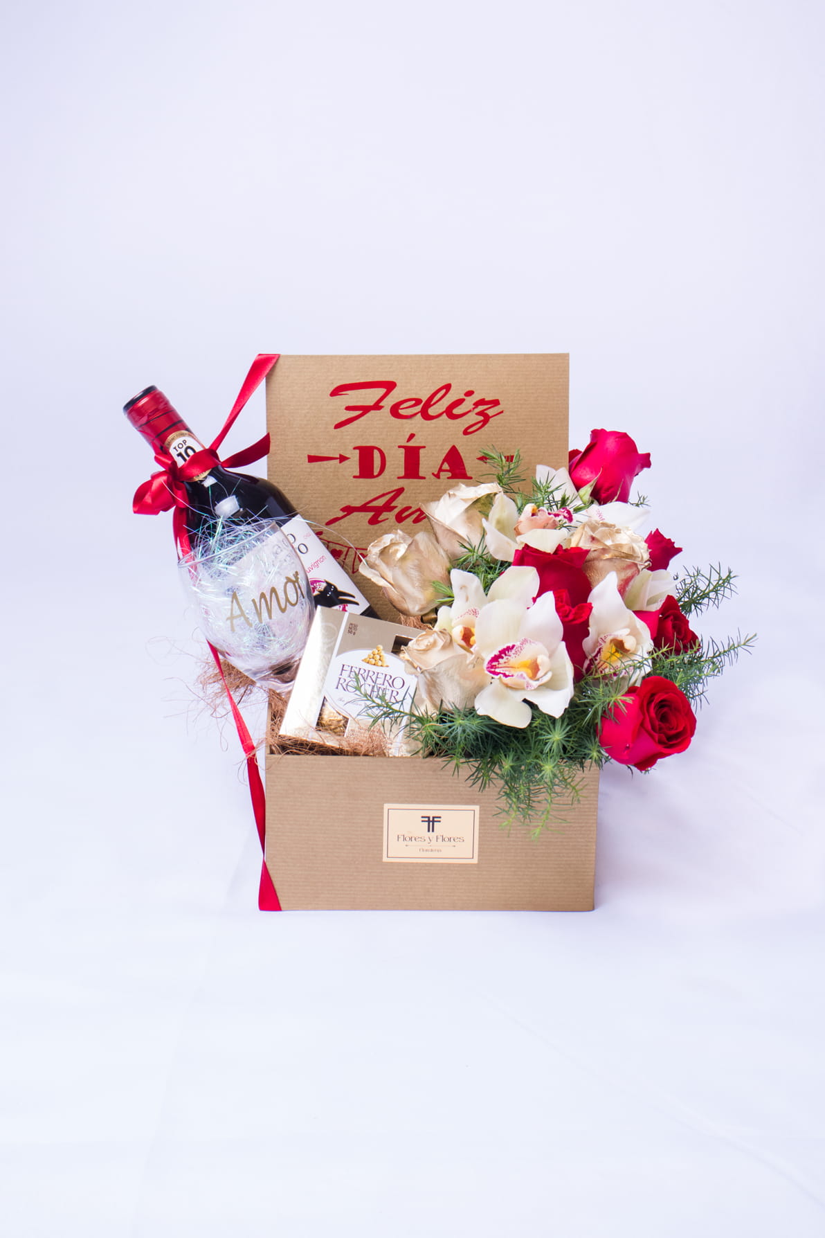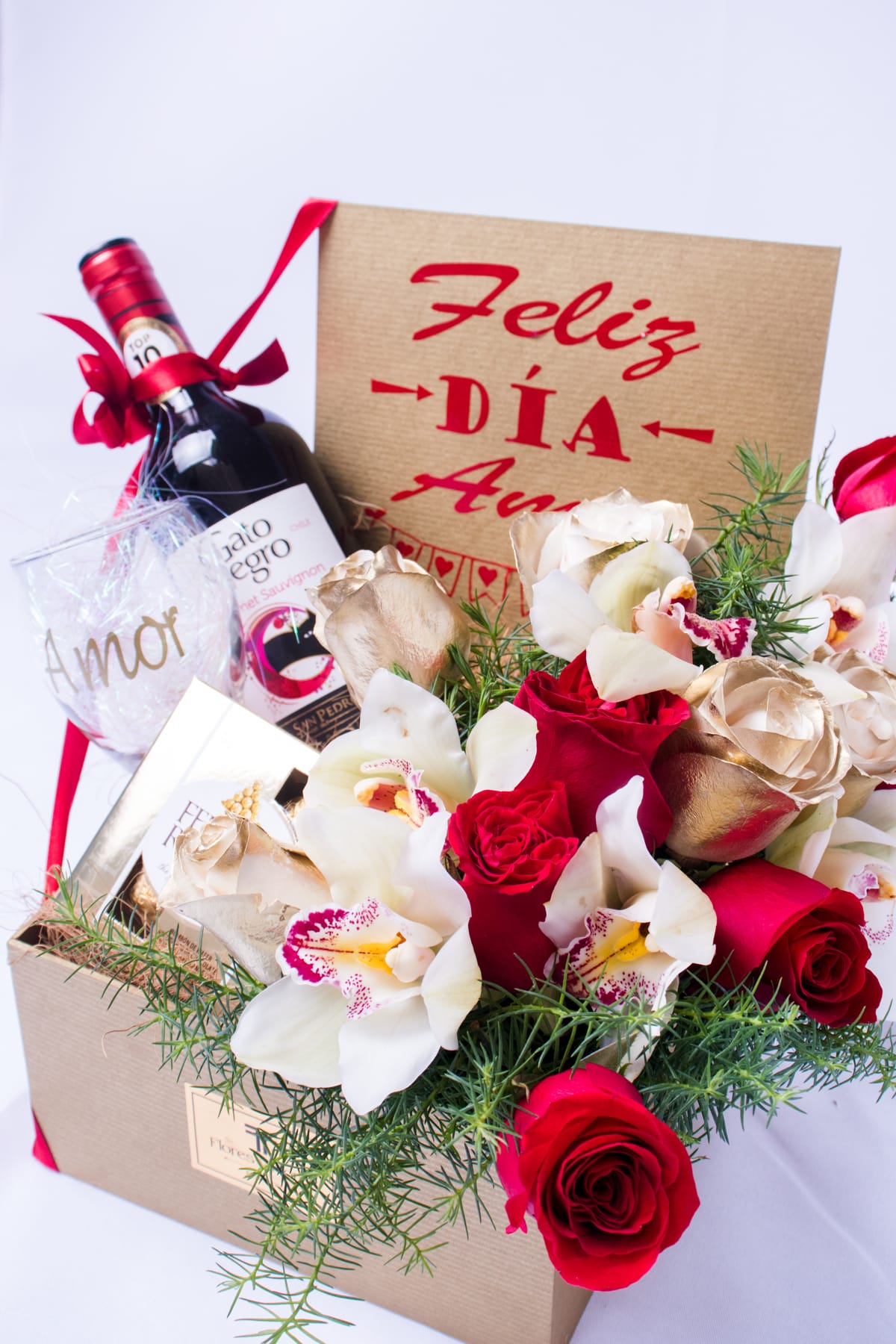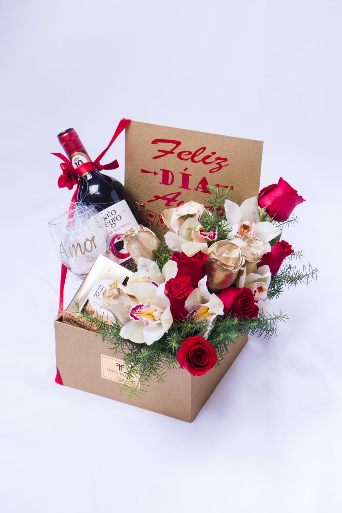 Happy love day book box, includes a bottle of black cat wine, a glass cup with a love message, a box of 8 Ferrero chocolates, plus 5 cymbidium orchids, 5 golden roses, 5 red roses, includes a card that you can personalize.