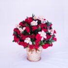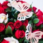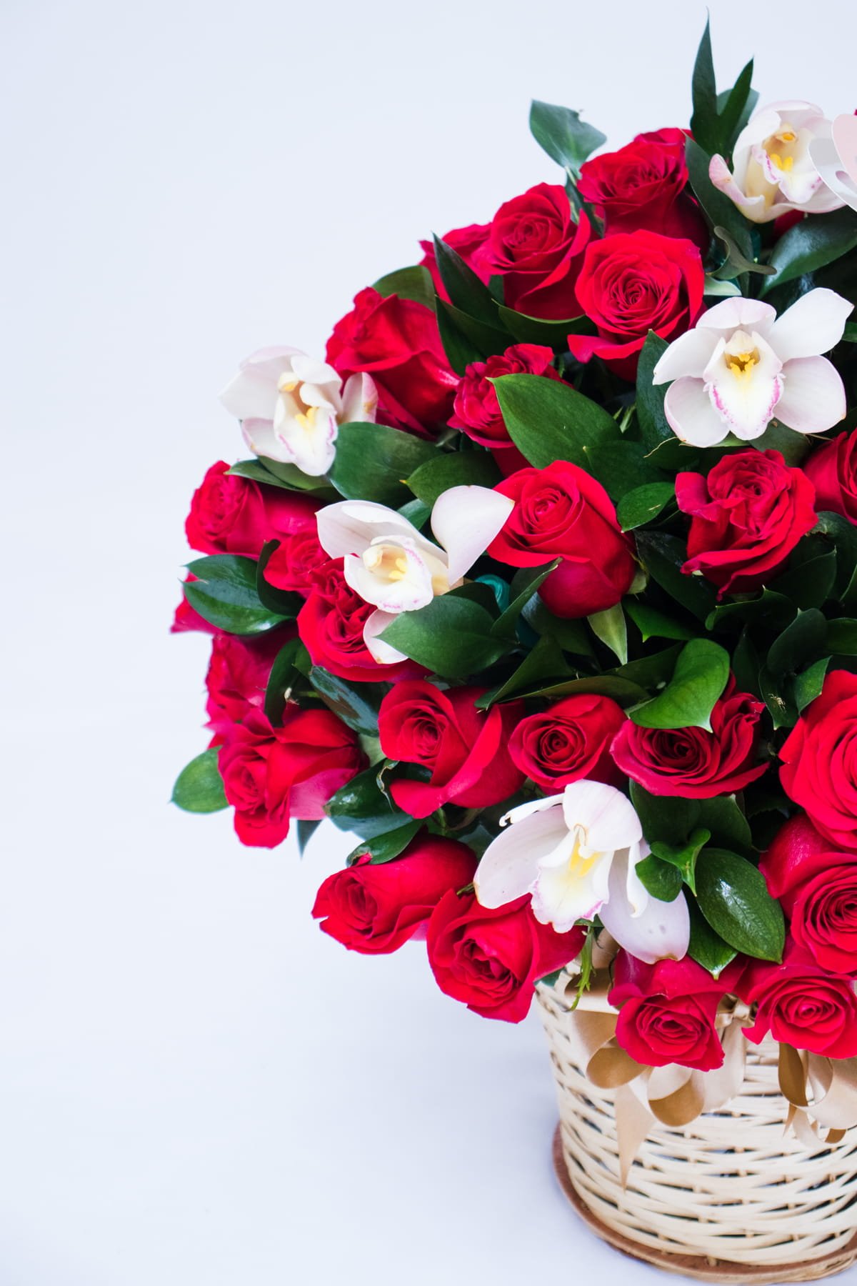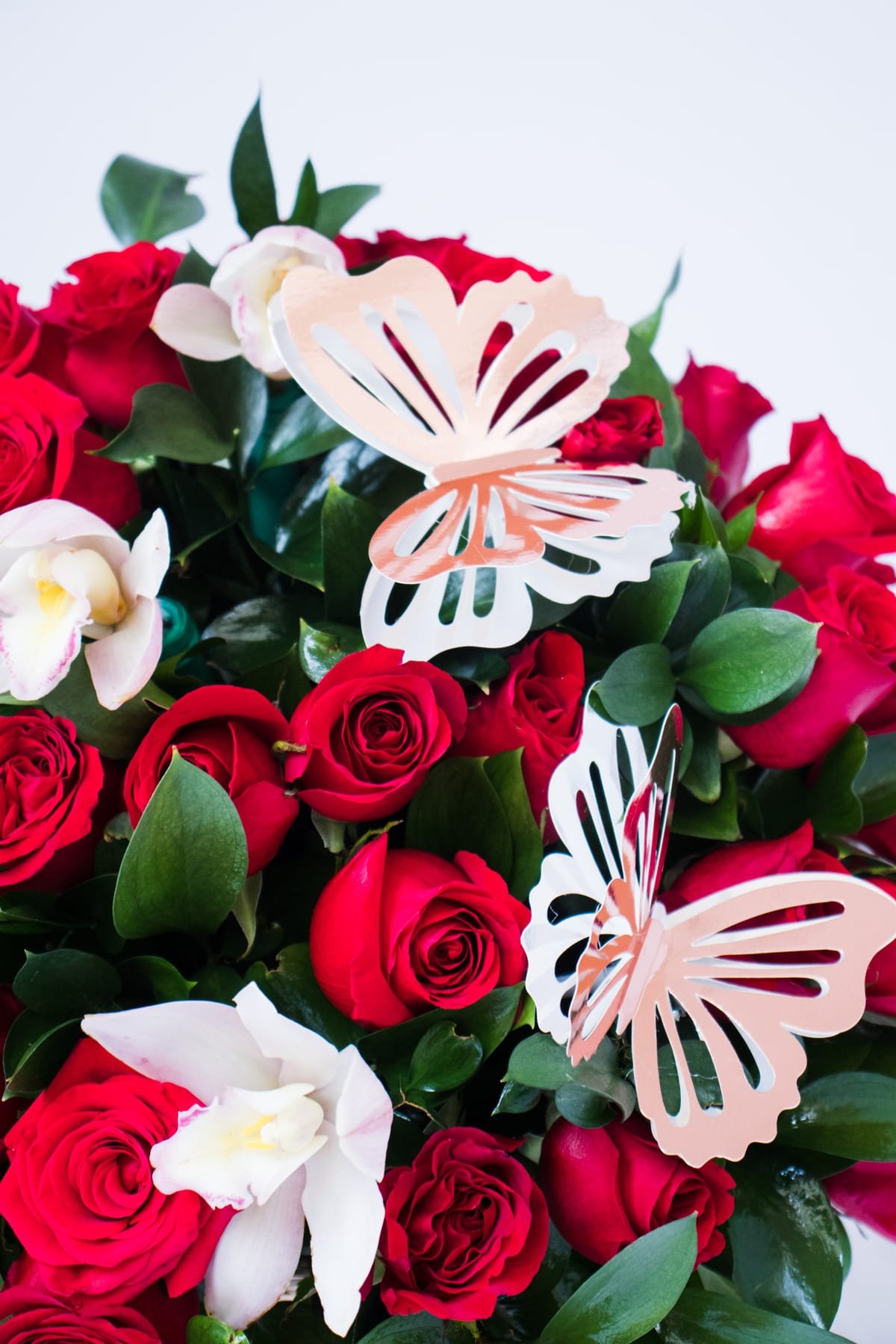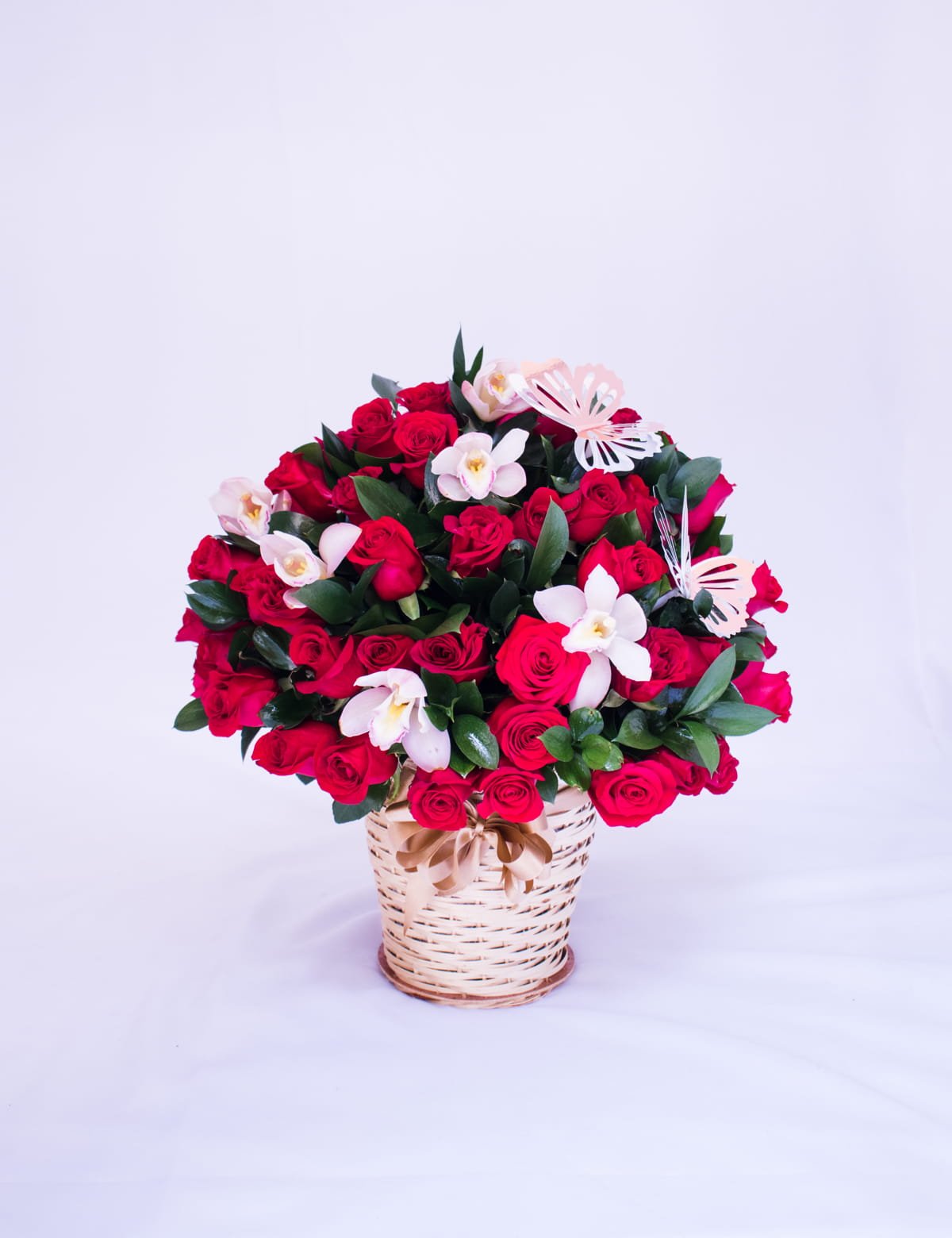Beautiful wicker basket with 50 red roses, 7 cymbidium orchids and two butterflies, includes personalized message.