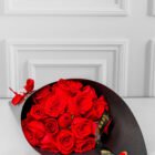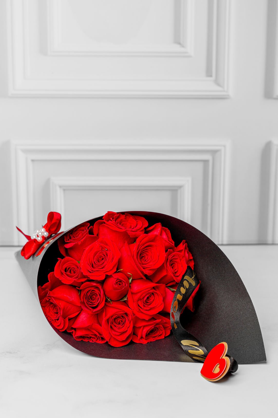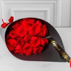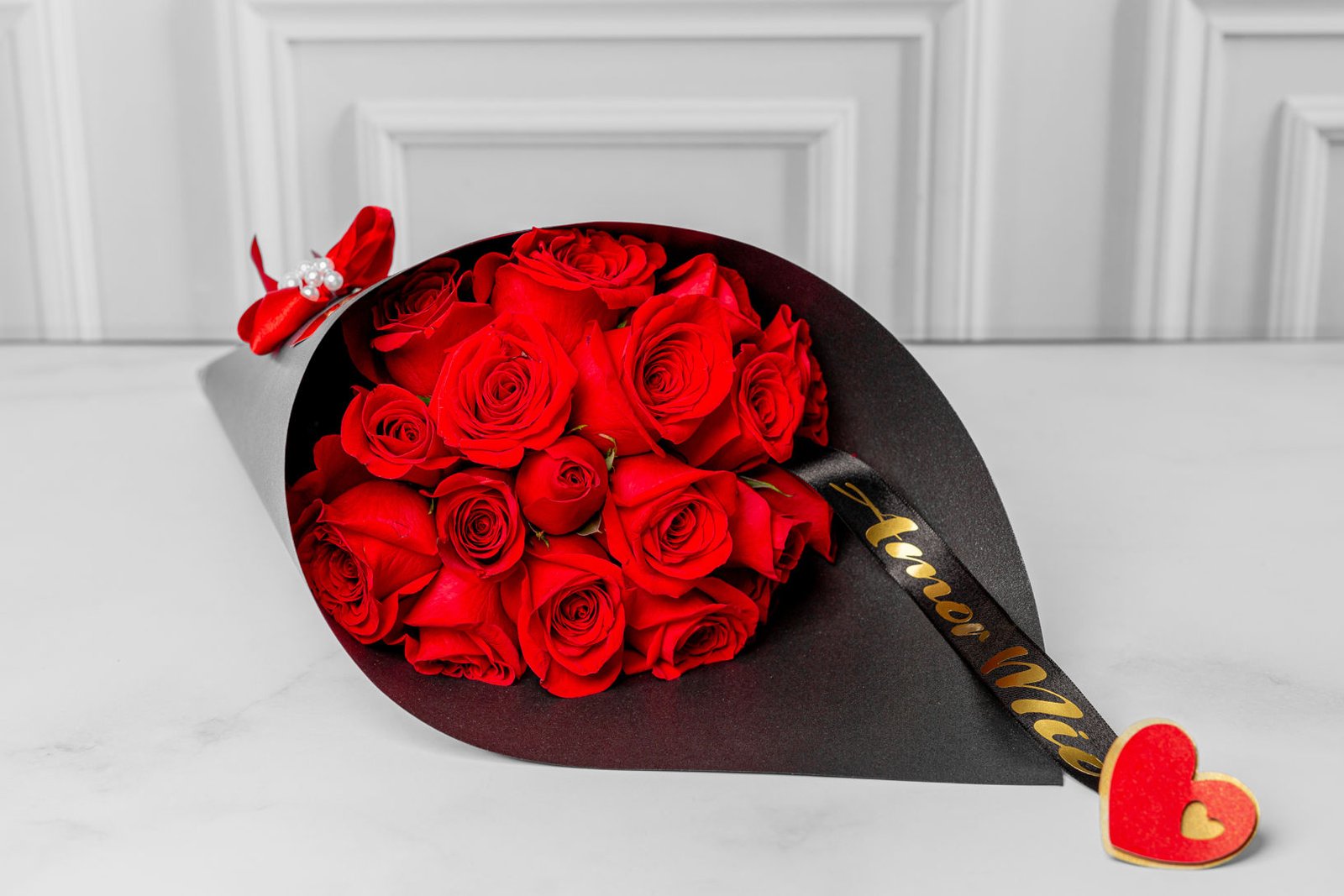 Our traditional luxury bouquet in a black cone, featuring beautiful red roses and a personalized ribbon with a seasonal message, is sure to surprise your loved one. Includes a card with a personalized message.