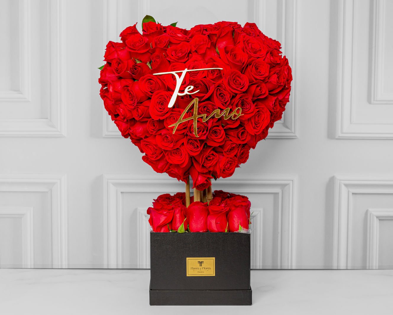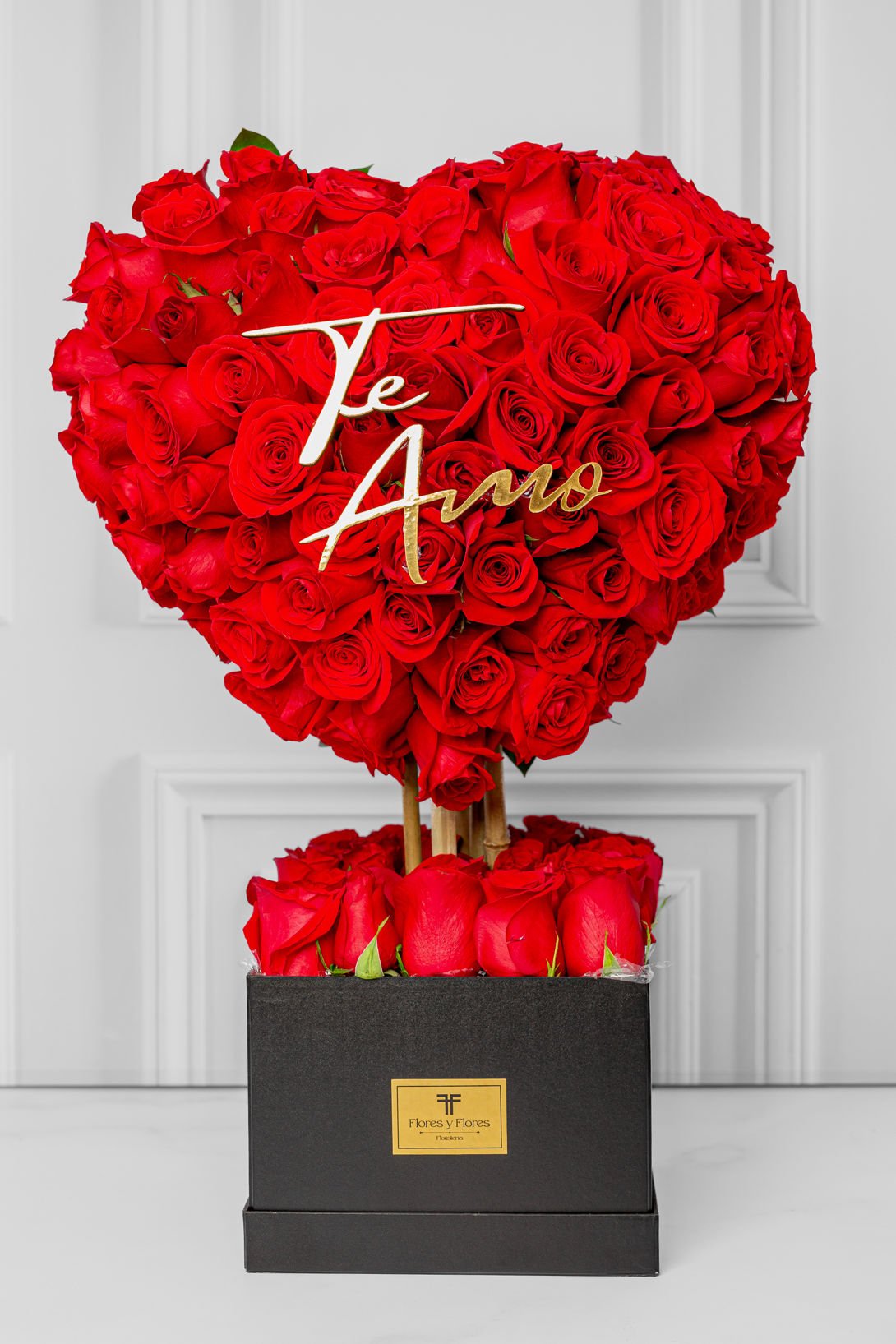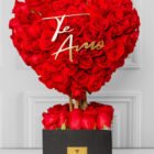 Luxury 3D heart, with more than 100 red roses of the best quality, a unique design, perfect to surprise your loved one, this beautiful arrangement includes a topper with a seasonal message and a personalized card.