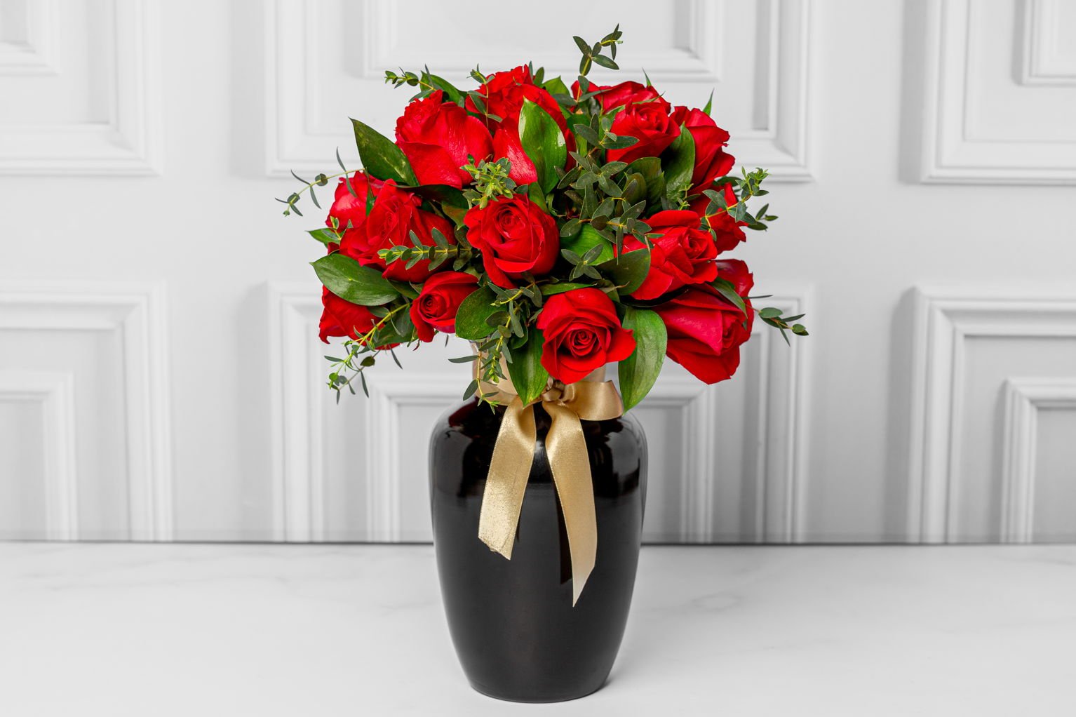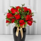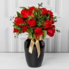 A luxurious black vase, accompanied by 36 red roses and seasonal foliage, such as butcher’s broom and parvifolia, is perfect for surprising guests. Includes a card with a personalized message.