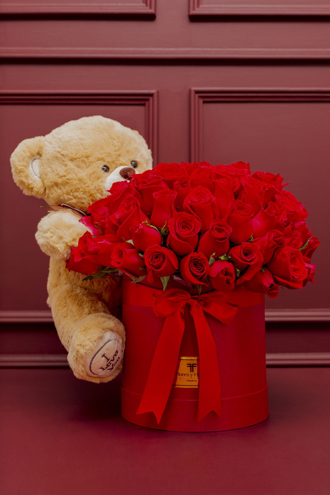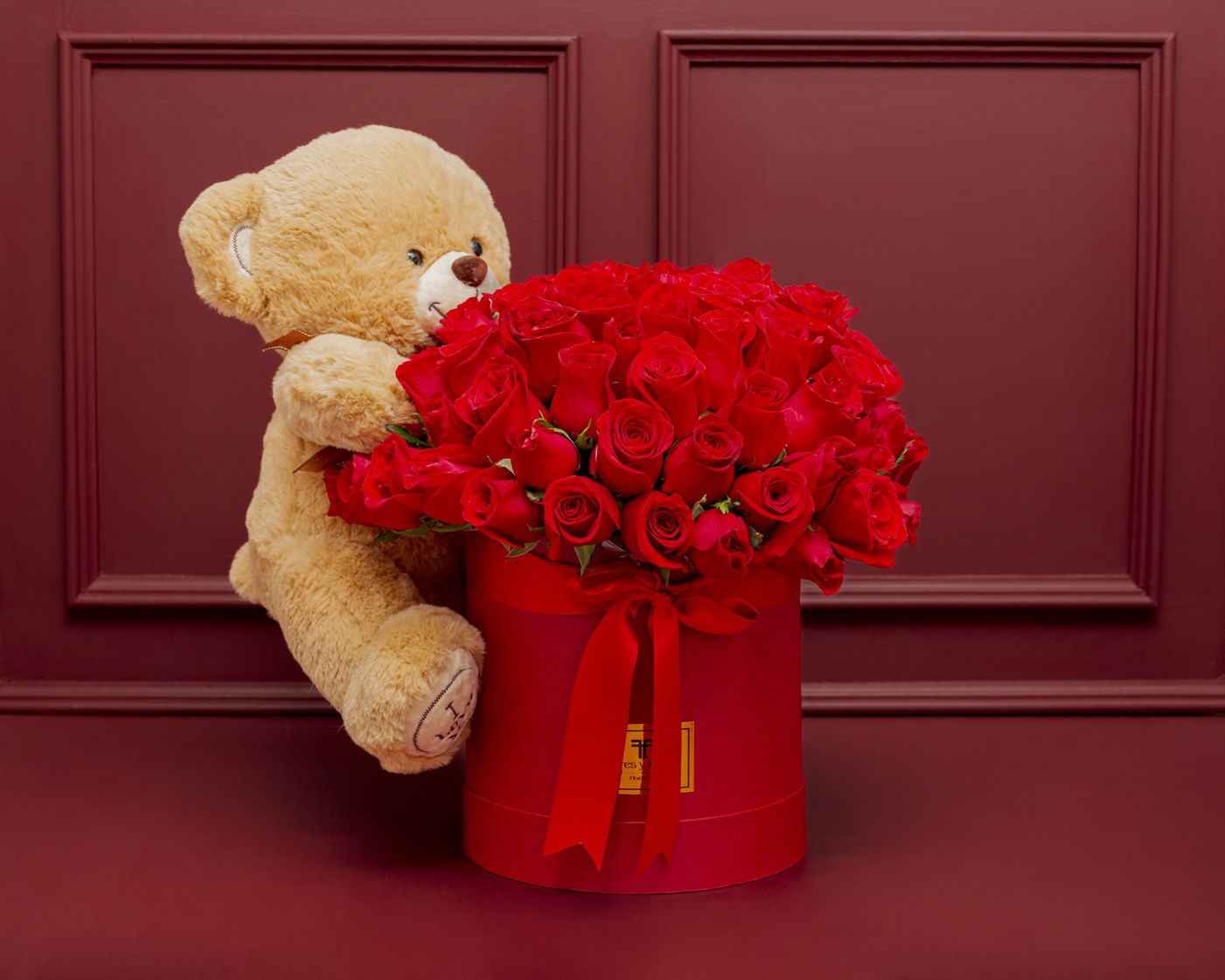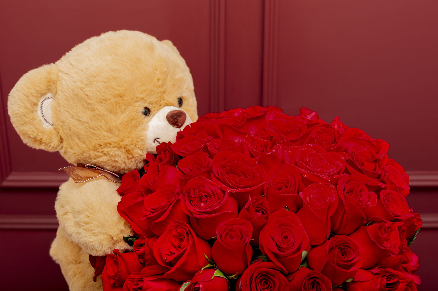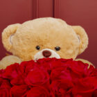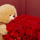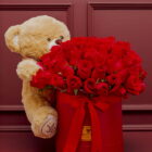 Exclusive floral arrangement with 100 red roses in a luxury red box, accompanied by a beautiful medium-sized teddy bear. The teddy bear’s design may vary depending on availability. It’s the perfect combination of luxury and tenderness. Includes a personalized card and care instructions for the floral arrangement.