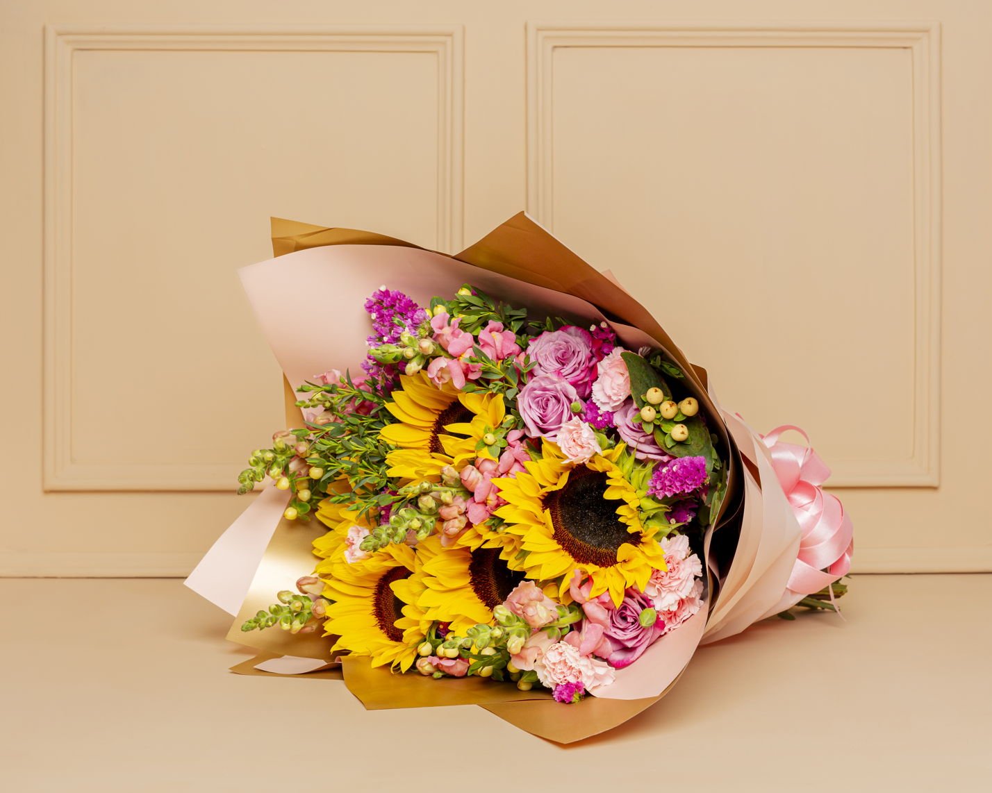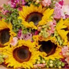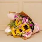 A beautiful, colorful bouquet featuring sunflowers, roses, and fresh seasonal flowers. Wrapped in imported paper and decorated with a bow that perfectly complements the entire floral arrangement. A blend that conveys joy and light, perfect for surprising Mom. Includes a card with a personalized message and a care card for the floral arrangement.