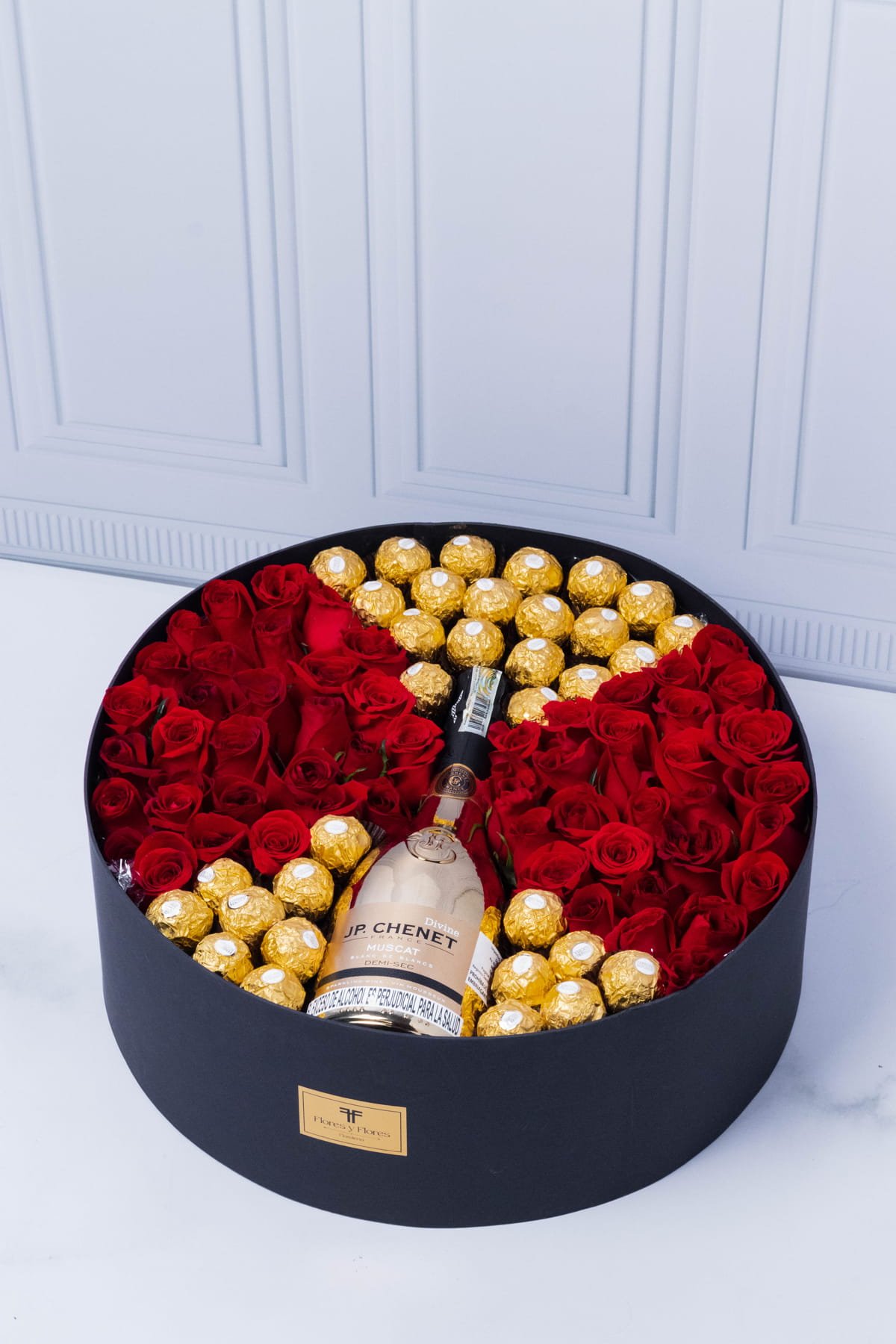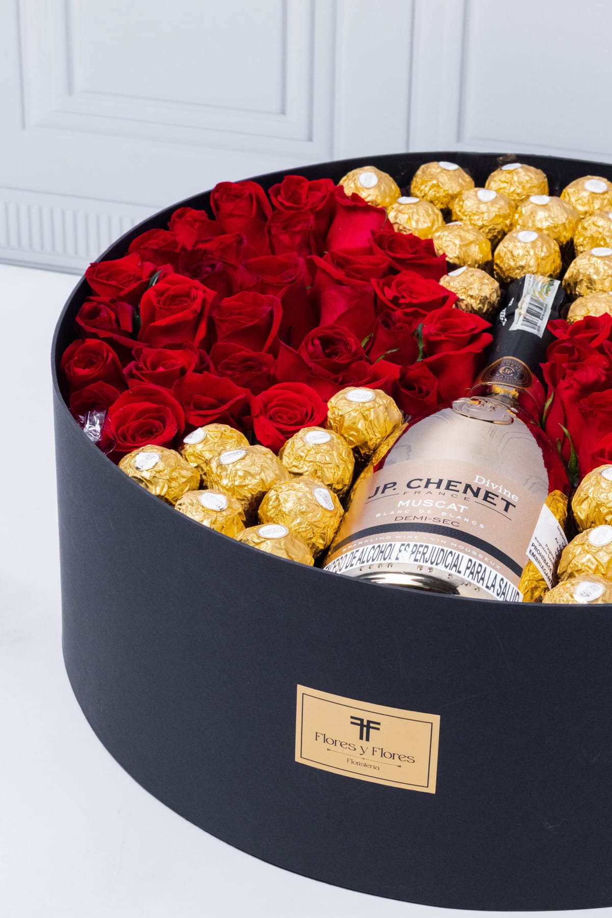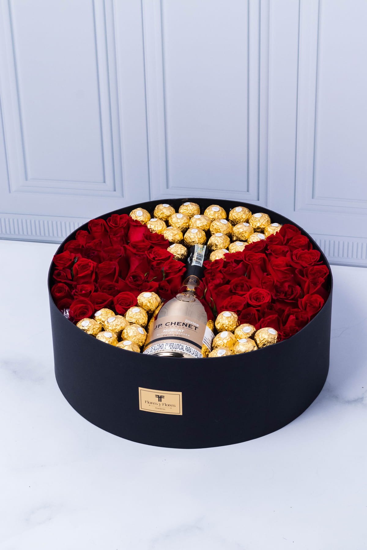 Hermosa caja de lujo con 80 rosas, 33 chocolates ferrero, champaña JP Chenet dorada, una combinación perfecta para sorprender a esa persona especial en tu vida. Incluye tarjeta con mensaje que puedes personalizar.