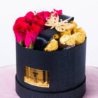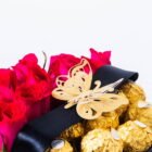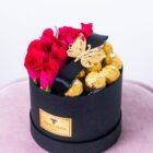 A box with fuchsia roses and Ferrero chocolates, decorated with a beautiful butterfly, includes a card with a message that you can personalize.