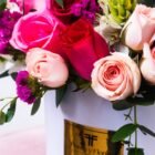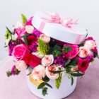 Beautiful little box with roses, including fuchsias, pinks, pink mini roses, and seasonal foliage, in a lovely presentation. Includes a card with a message that you can personalize.