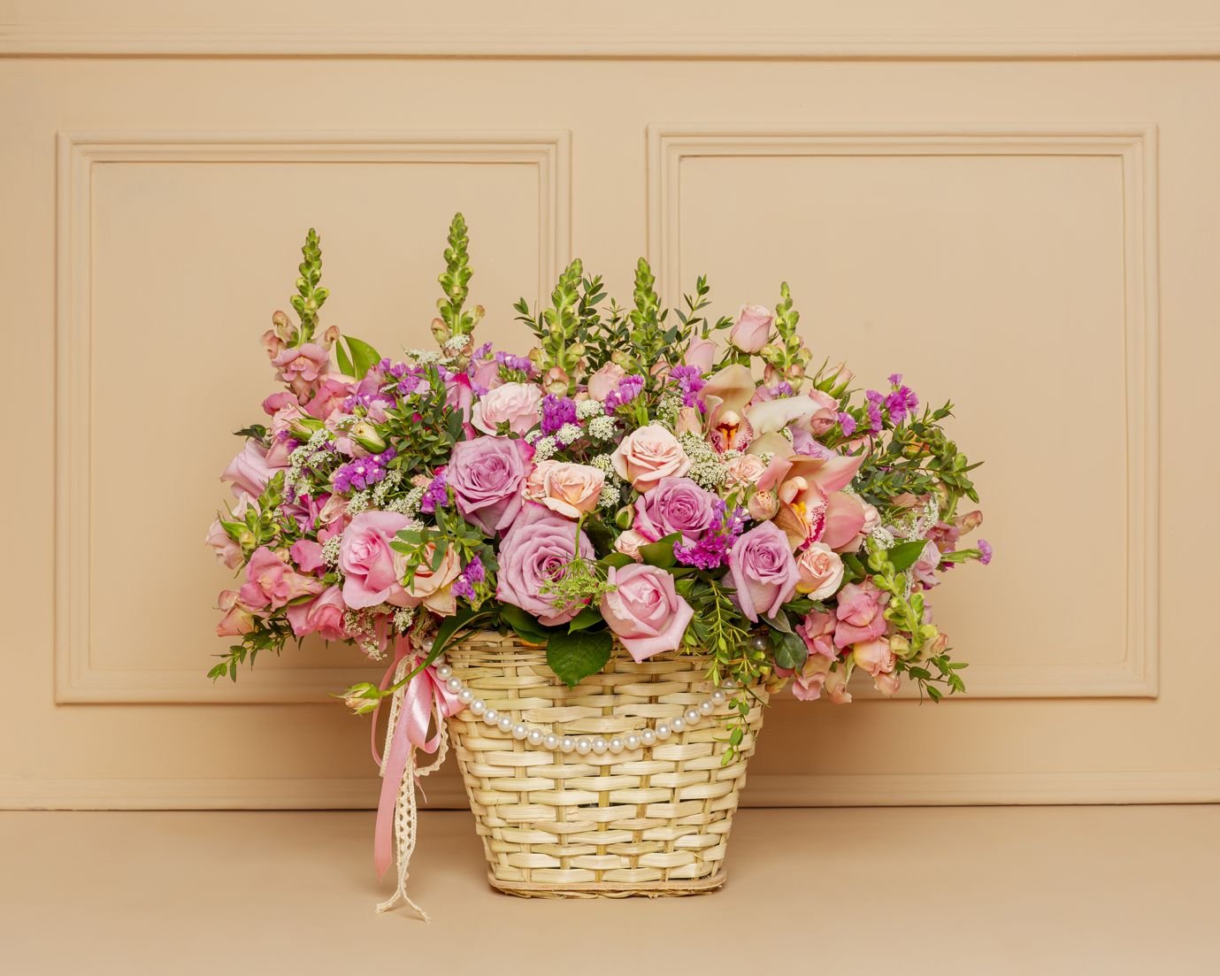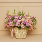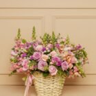 A hand-woven basket arrangement celebrating the sweetness of a mother’s love. Composed of roses, alstroemerias, snapdragons, and fresh seasonal flowers in shades of pink and lavender, this floral garden evokes tenderness, elegance, and life. Includes a personalized card and a care card for the floral arrangement.