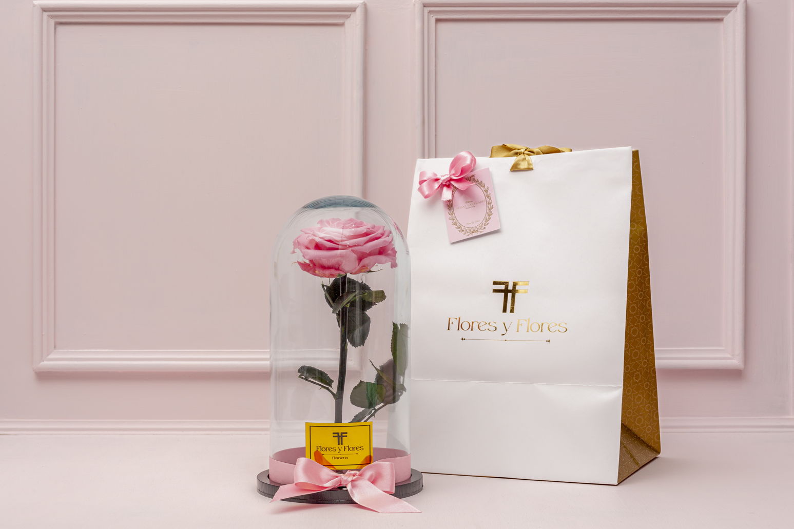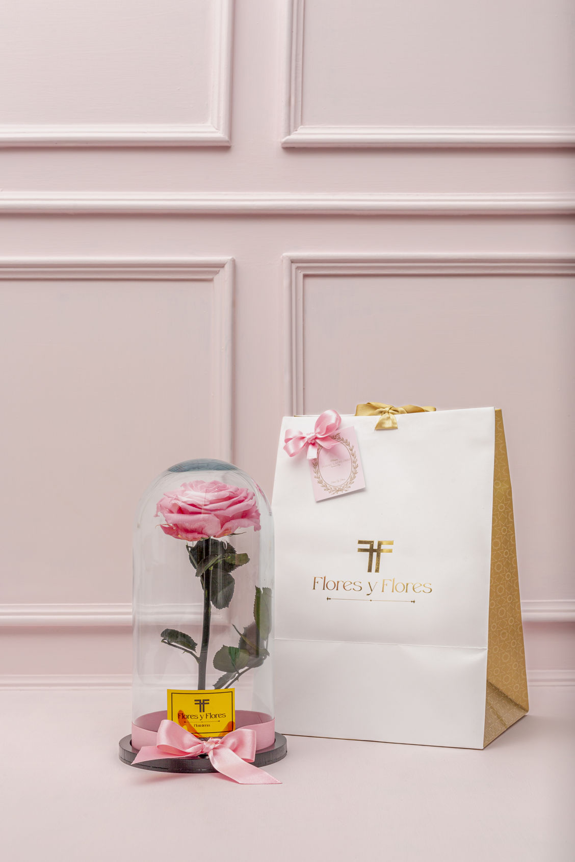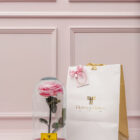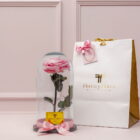 A beautiful, premium, pink preserved rose in a special edition glass urn and wooden base, lasting for over two years, accompanied by a luxury bag, personalized card, and preserved rose care instructions.