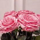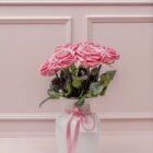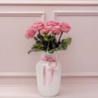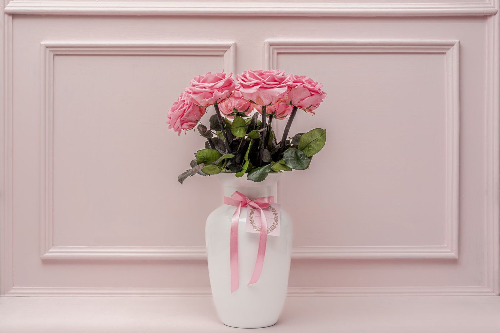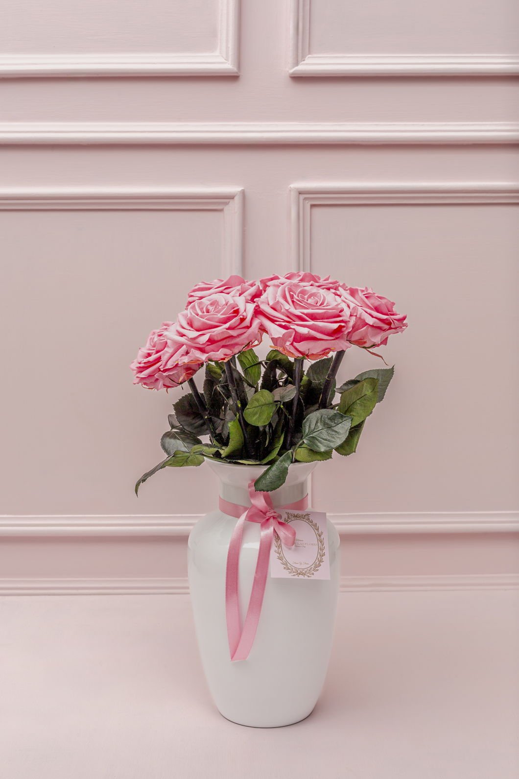 An elegant white luxury vase, accompanied by six premium pink preserved roses, carefully selected to maintain their beauty for over two years. A sophisticated and timeless gift, ideal for those who appreciate elegance and delicacy in every detail. Includes a personalized card and care guide.