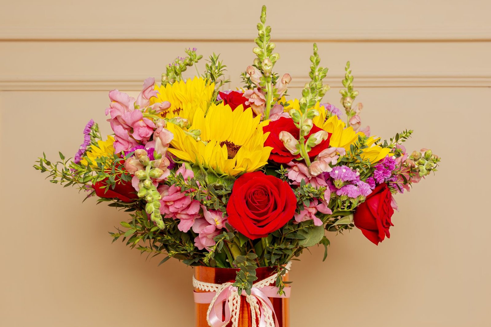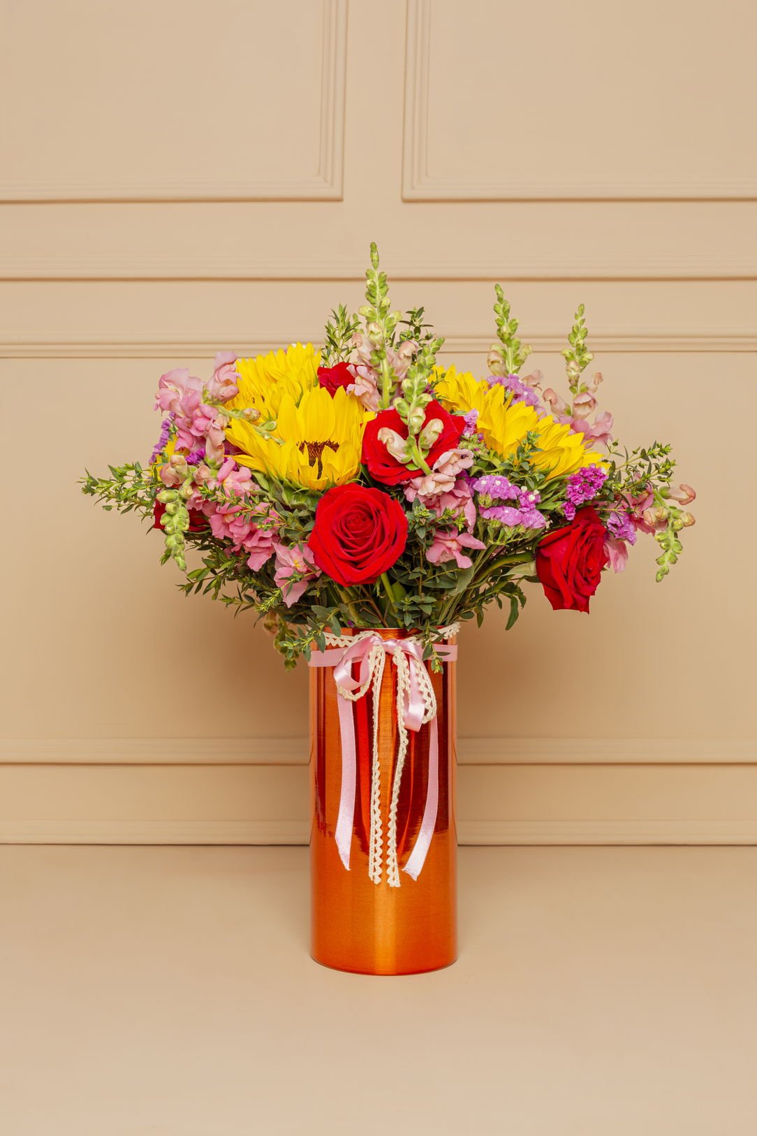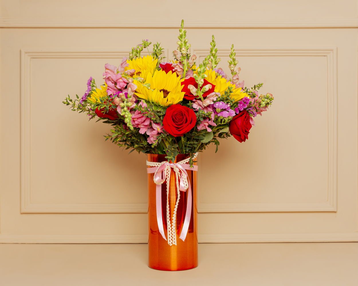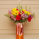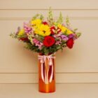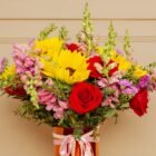 A beautiful rose gold vase, full of energy and love. Composed of sunflowers, red roses, snapdragons, and seasonal flowers in vibrant hues that brighten any space. Decorated with romantic bows, it’s the ideal gift for a happy, strong, and luminous mom. Includes a personalized card and a care card for the floral arrangement.