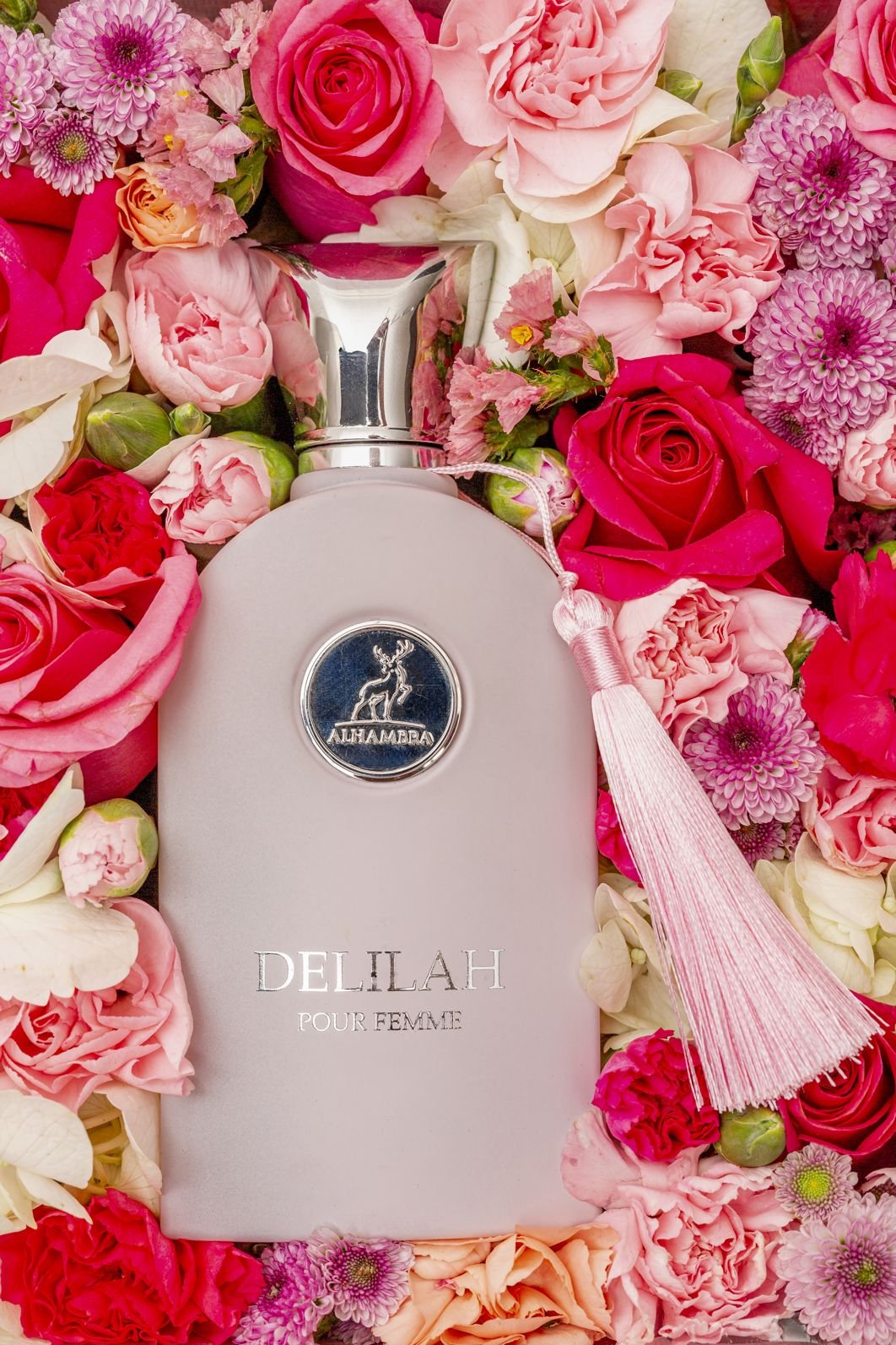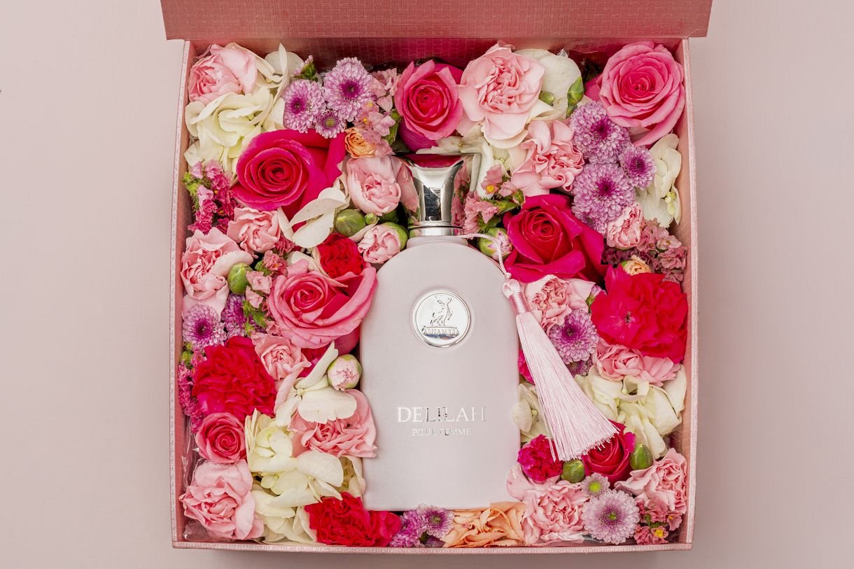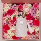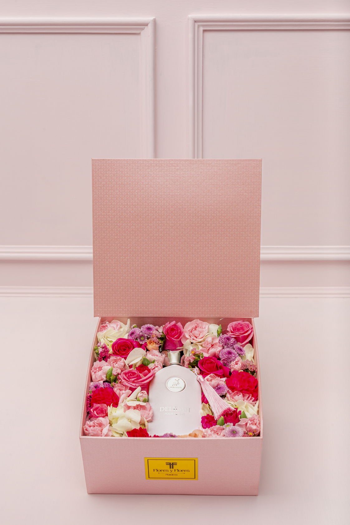 Perfumes and flowers, the perfect combination of elegance and essence. Beautiful pink box, with flowers such as roses, hydrangeas, carnations, and other seasonal flowers. Delilah perfume is a floral explosion with spicy and sweet touches. Includes a personalized card and a card with the care instructions for the floral arrangement.