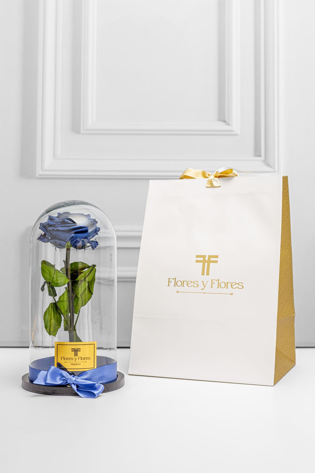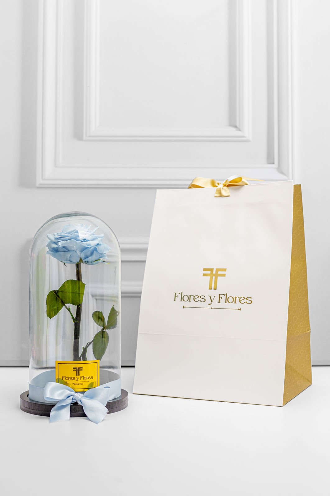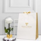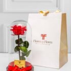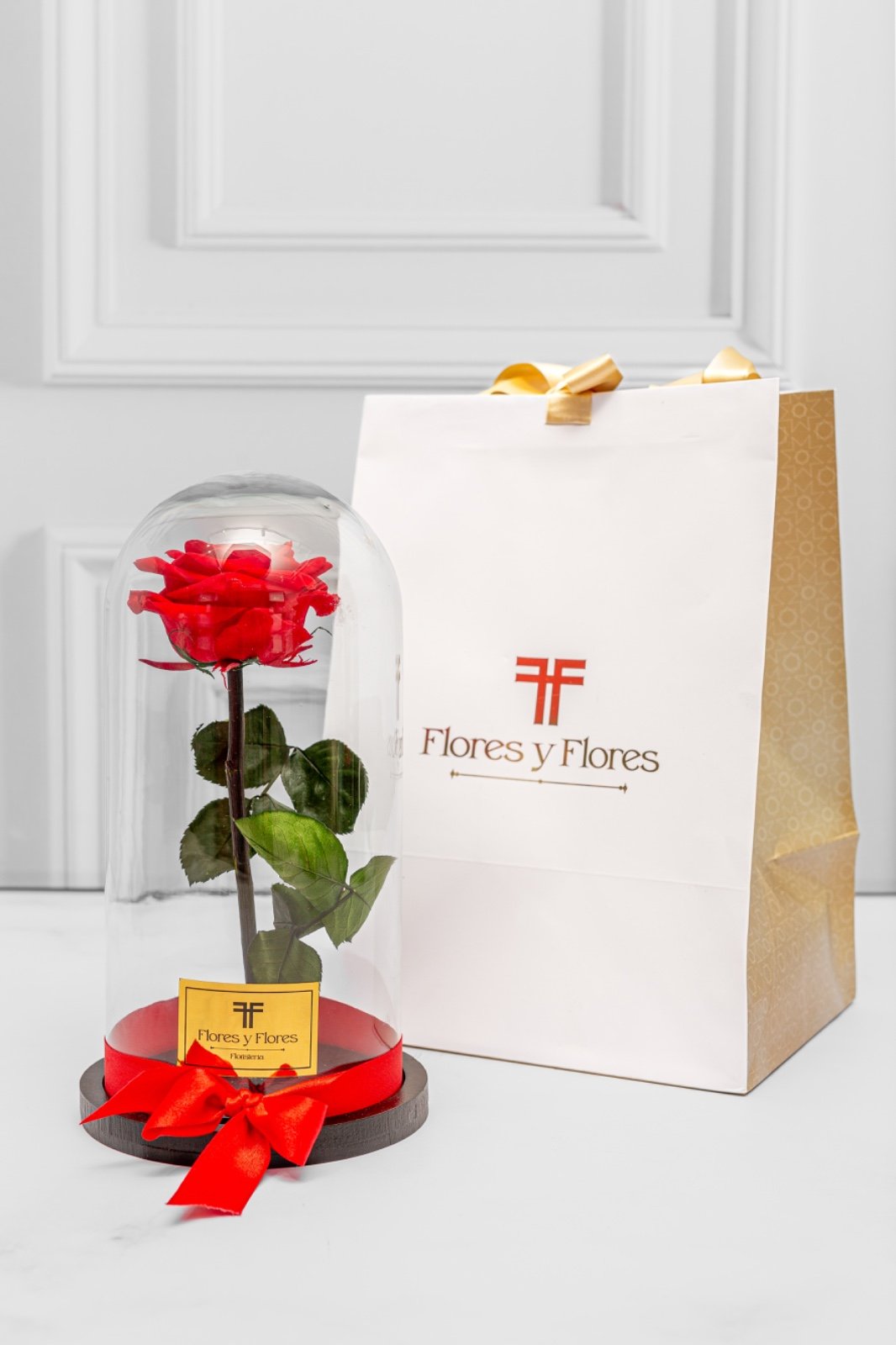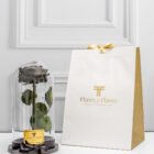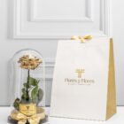 Hermosa rosa preservada premium en urna de cristal y base de madera, con una duración de más dos años, acompañada con una bolsa de lujo y tarjeta con mensaje que puedes personalizar.