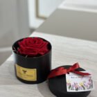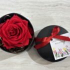 Beautiful preserved red rose in a luxury black box, lasting for over two years, with a special edition message, includes a card with a personalized message and care instructions.