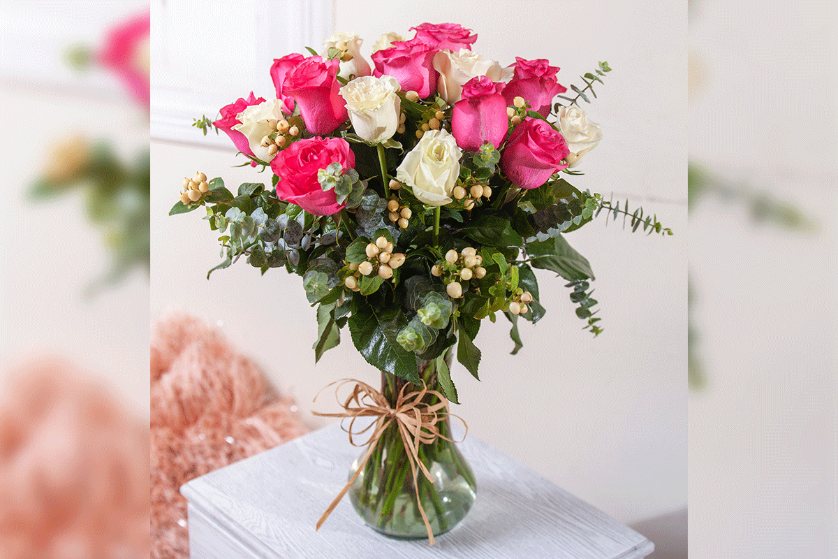 18 white and fuchsia roses, with white Iperico and eucalyptus, free vase.
