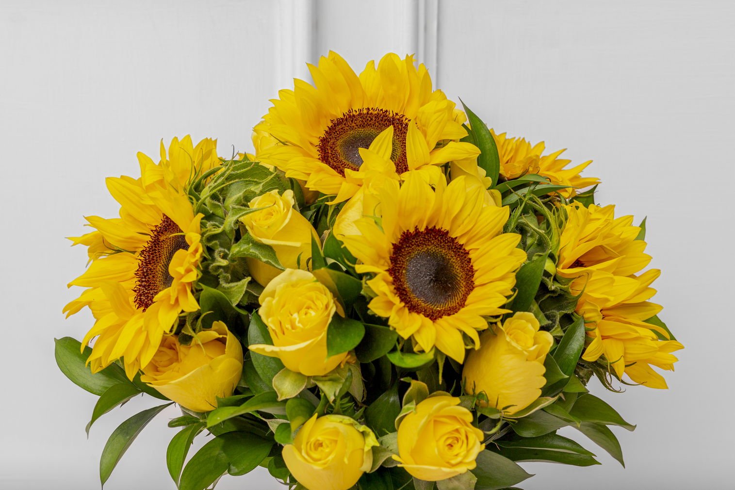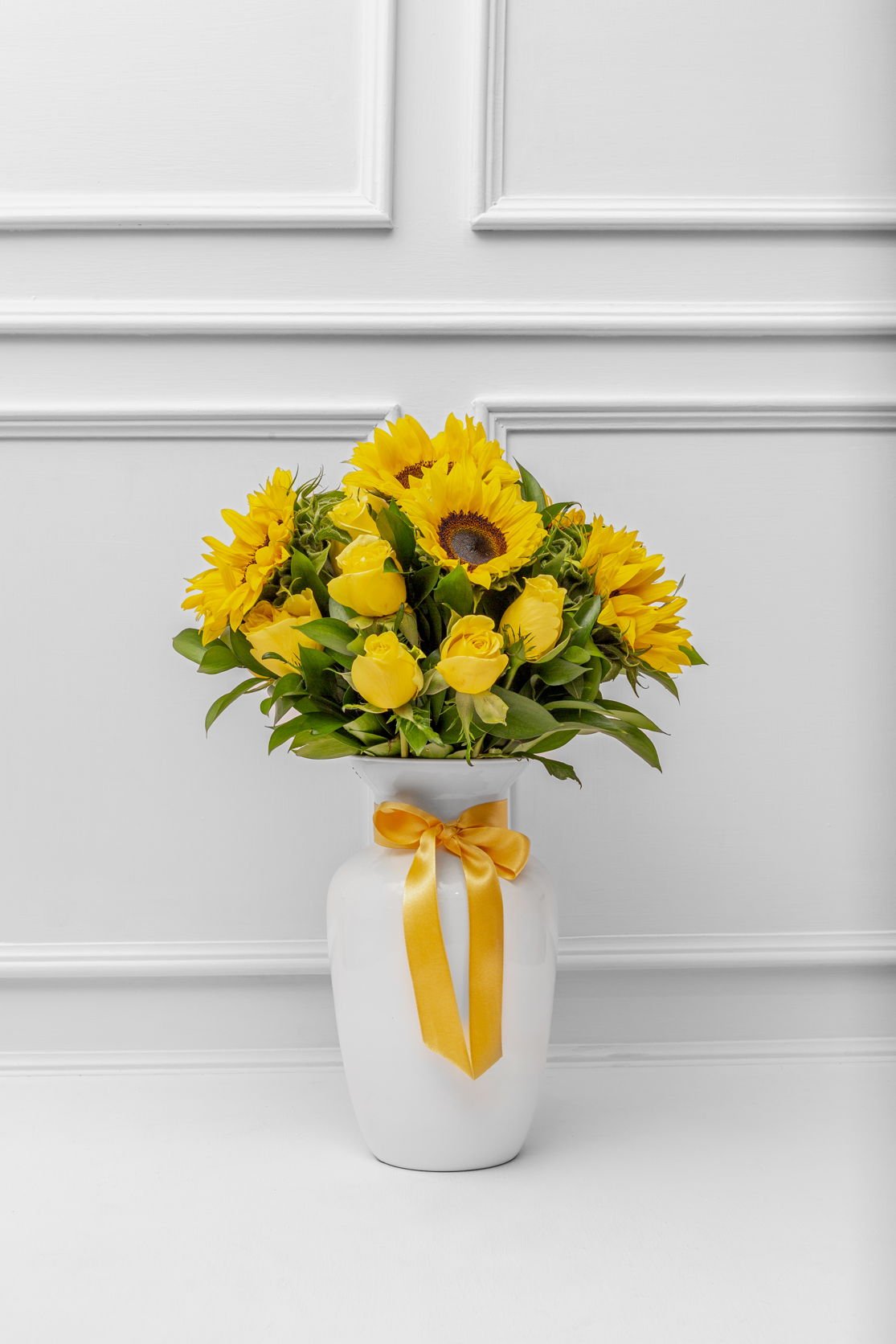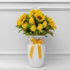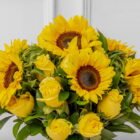 Hermoso florero con rosas amarillas y girasoles, la combinación perfecta, un arreglo lleno de vida y buenas vibras. Incluye tarjeta con mensaje personalizado y tarjeta con cuidados del arreglo floral.