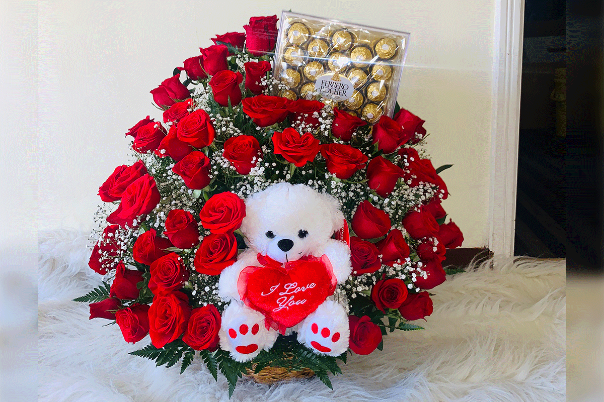 Arrangement of 70 semi-round red roses in a wicker basket, with ruscus and yifoxilia foliage, teddy bear (Bear design subject to availability), 24 Ferrero Rocher squid, and a card with a message that you can personalize.