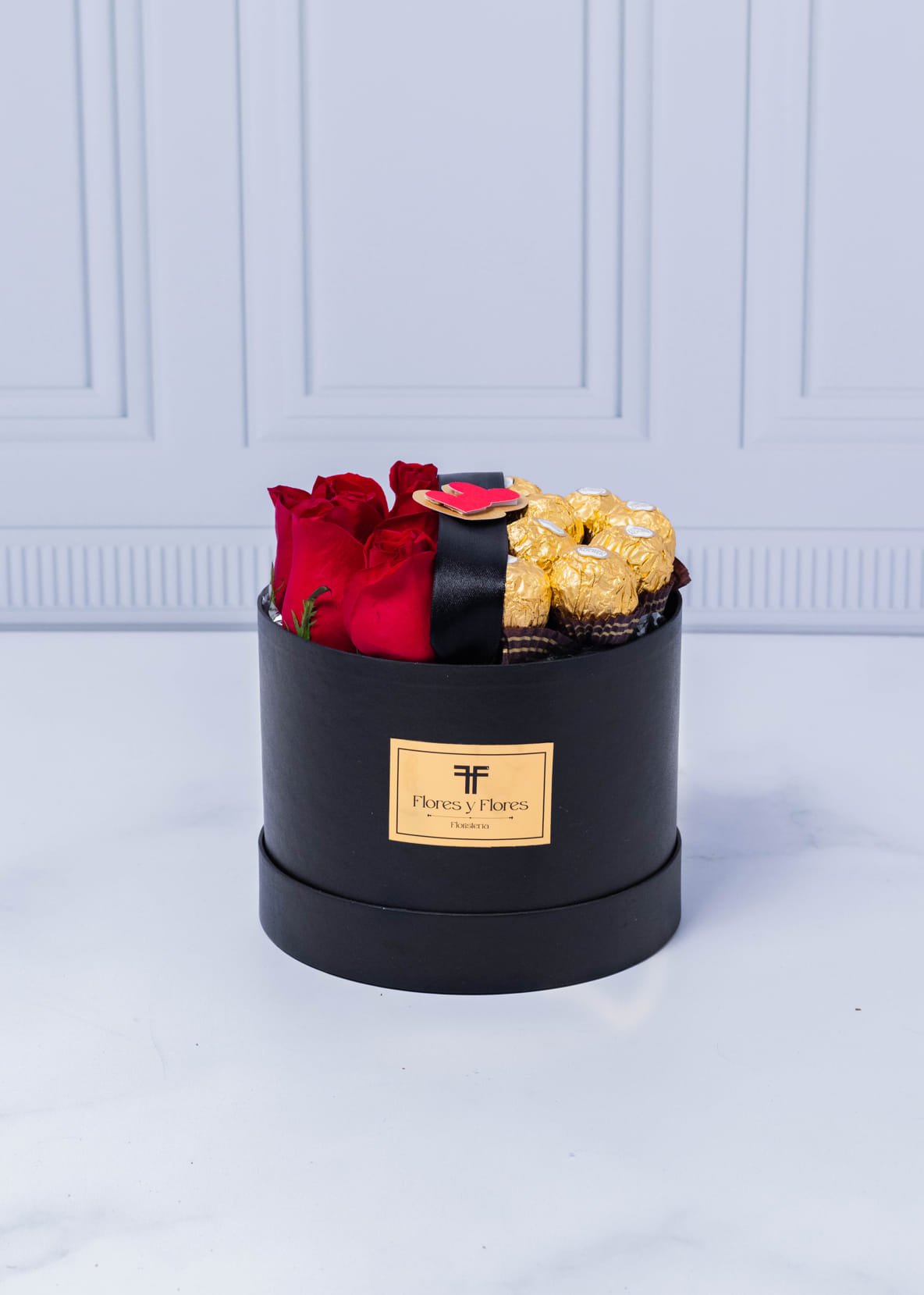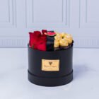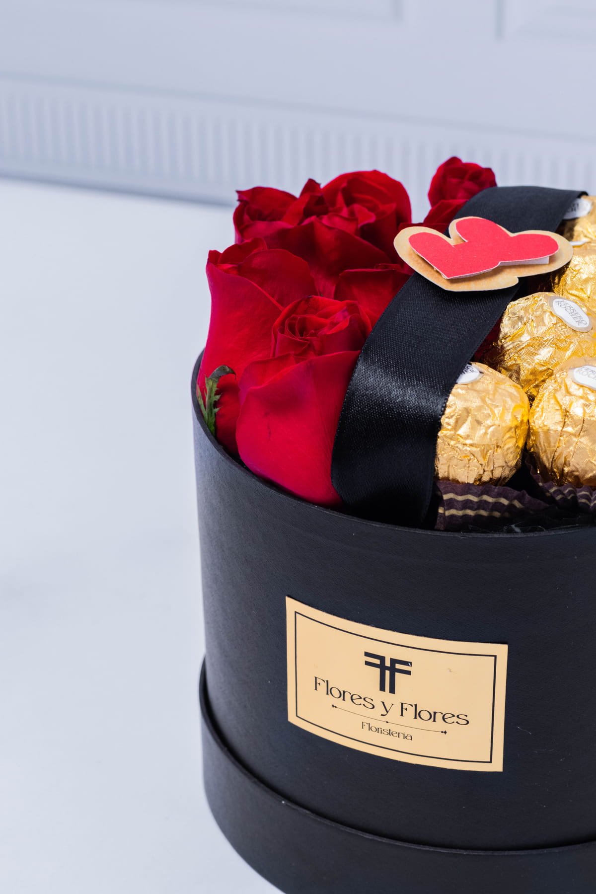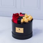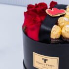 Cajita con 8 rosas rojas y 8 chocolates ferrero con lindo aplique de corazón, incluye tarjeta con mensaje que puedes personalizar.