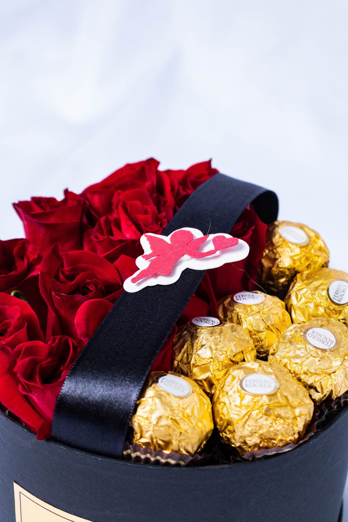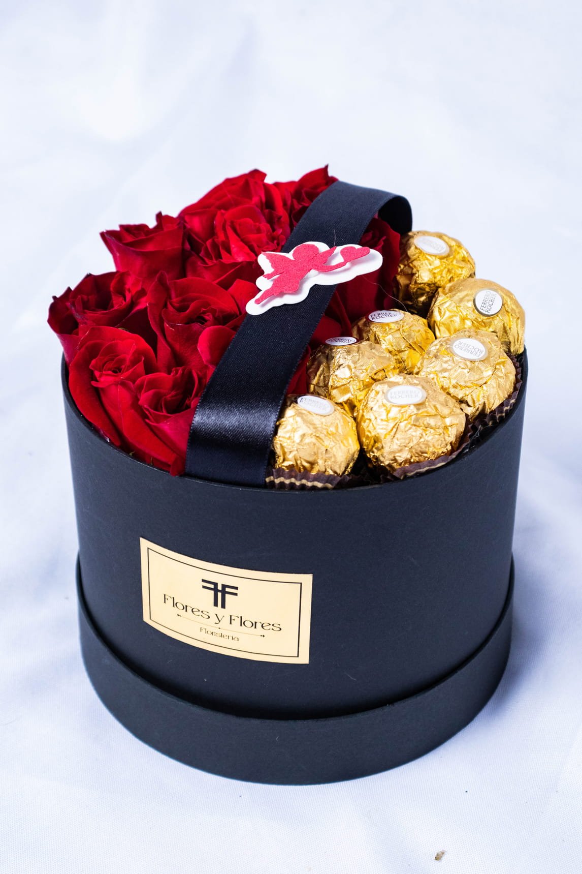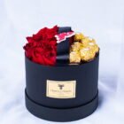 Beautiful box with 10 red roses and 8 Ferrero chocolates, beautifully presented for Valentine’s Day, including a card with a message you can personalize.