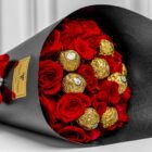 Beautiful luxury black cone with red roses, 8 Ferrero chocolates, a fabric ribbon bow, and pearls. Includes a card with a personalized message and care instructions. Perfect for a surprise.