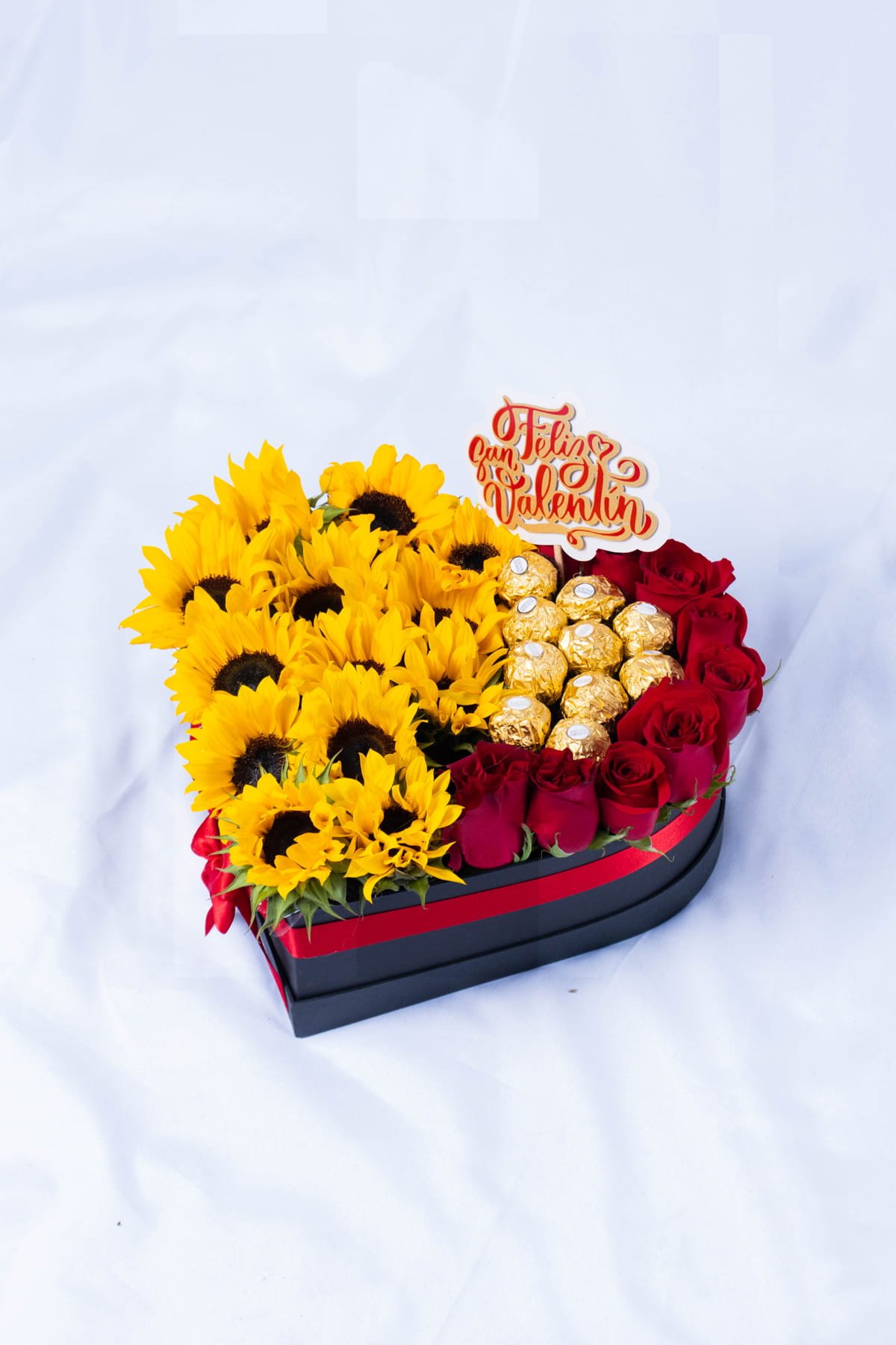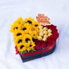 Heart-shaped box with 10 sunflowers, 10 pink roses, and 12 Ferrero chocolates, beautifully presented. Includes a card with a message you can personalize.