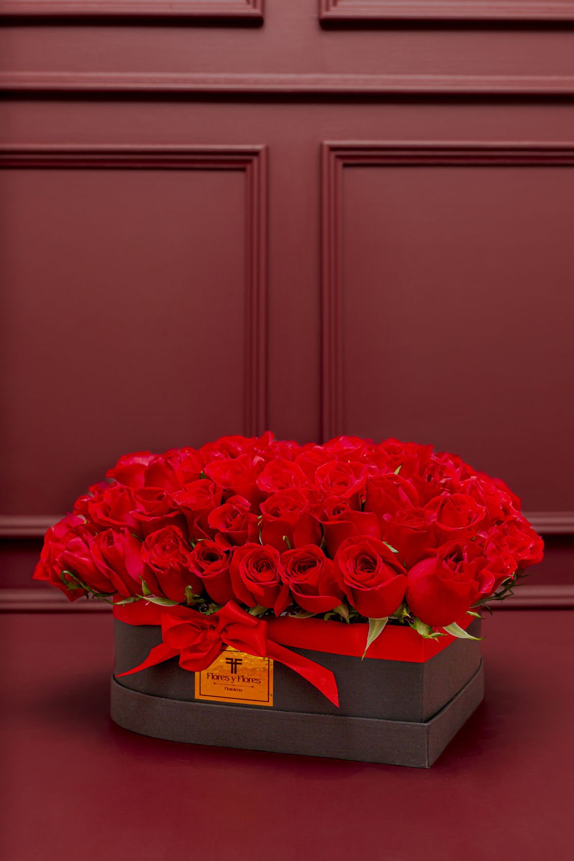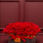 A beautiful heart in a luxury box, with 100 red roses arranged in a circular pattern, adding a touch of elegance and sophistication to the design. It comes with a red ribbon, a personalized card, and care instructions for the floral arrangement.