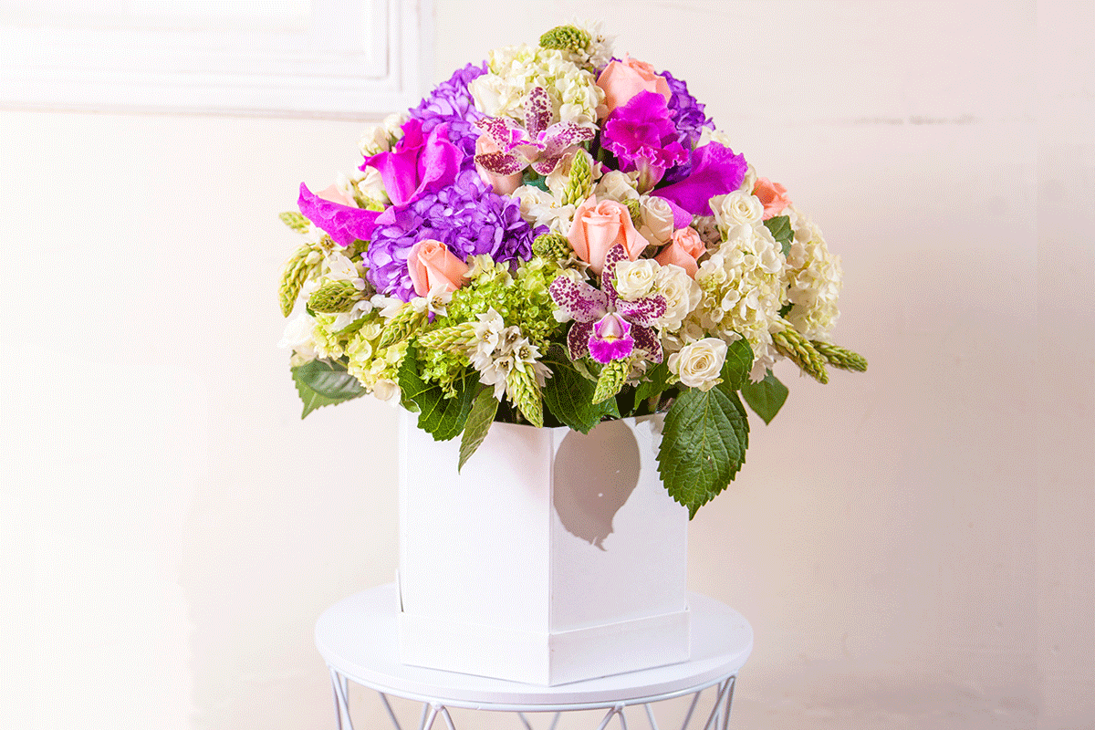 Beautiful box of purple orchids and hydrangeas with pink roses to show her how important she is to you with this beautiful combination.
