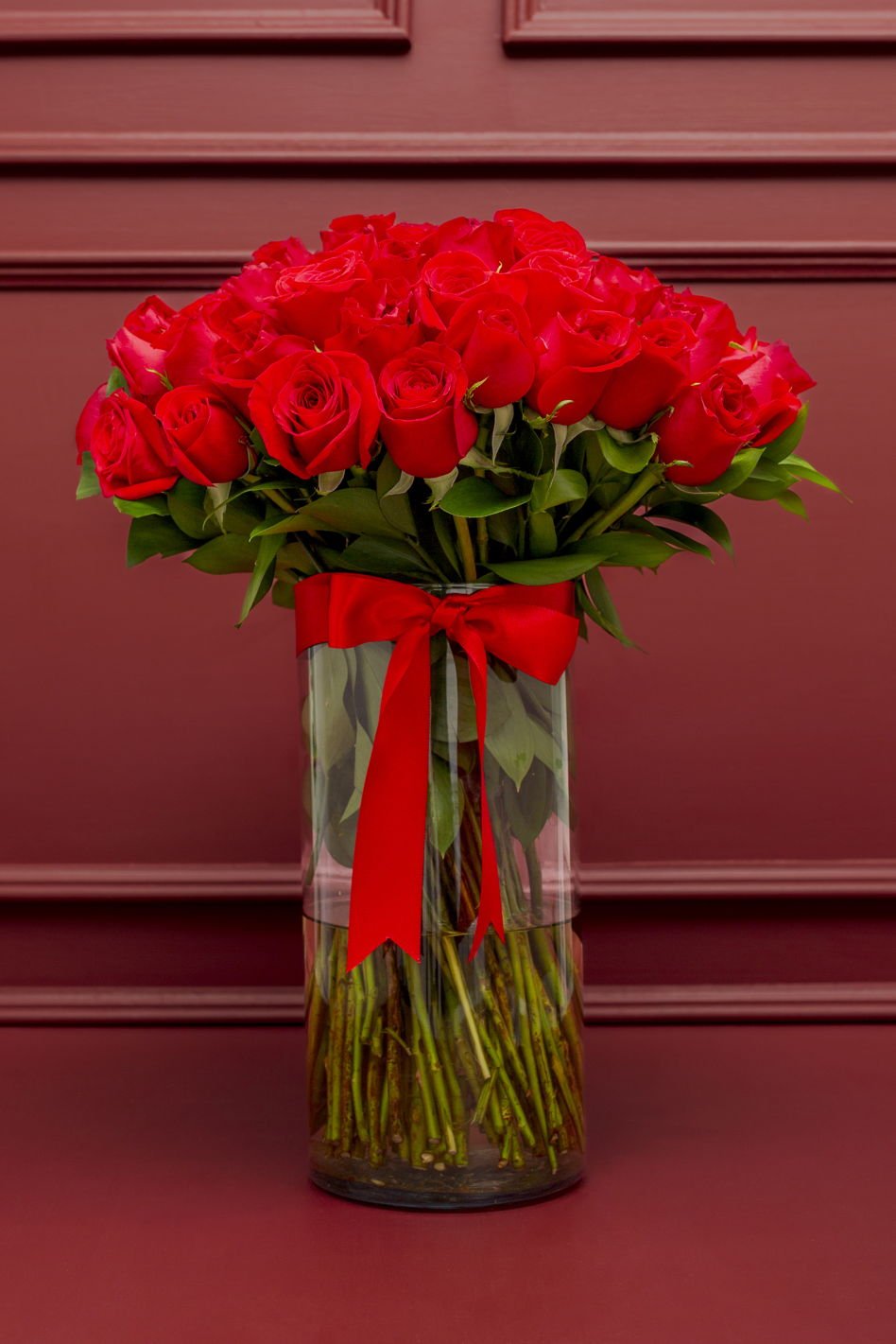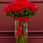 A beautiful cylindrical glass vase with 100 selected, top-quality red roses and a decorative bow will surprise that special someone with luxury and elegance in a gift. Includes a personalized card and care instructions.