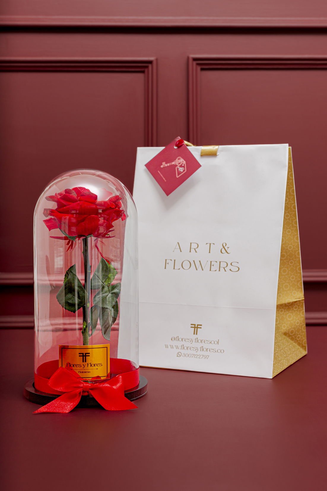Beautiful, premium preserved red rose in a glass urn and wooden base, Valentine’s Day edition, lasting over two years, accompanied by a luxury bag, personalized card, and rose care instructions.