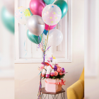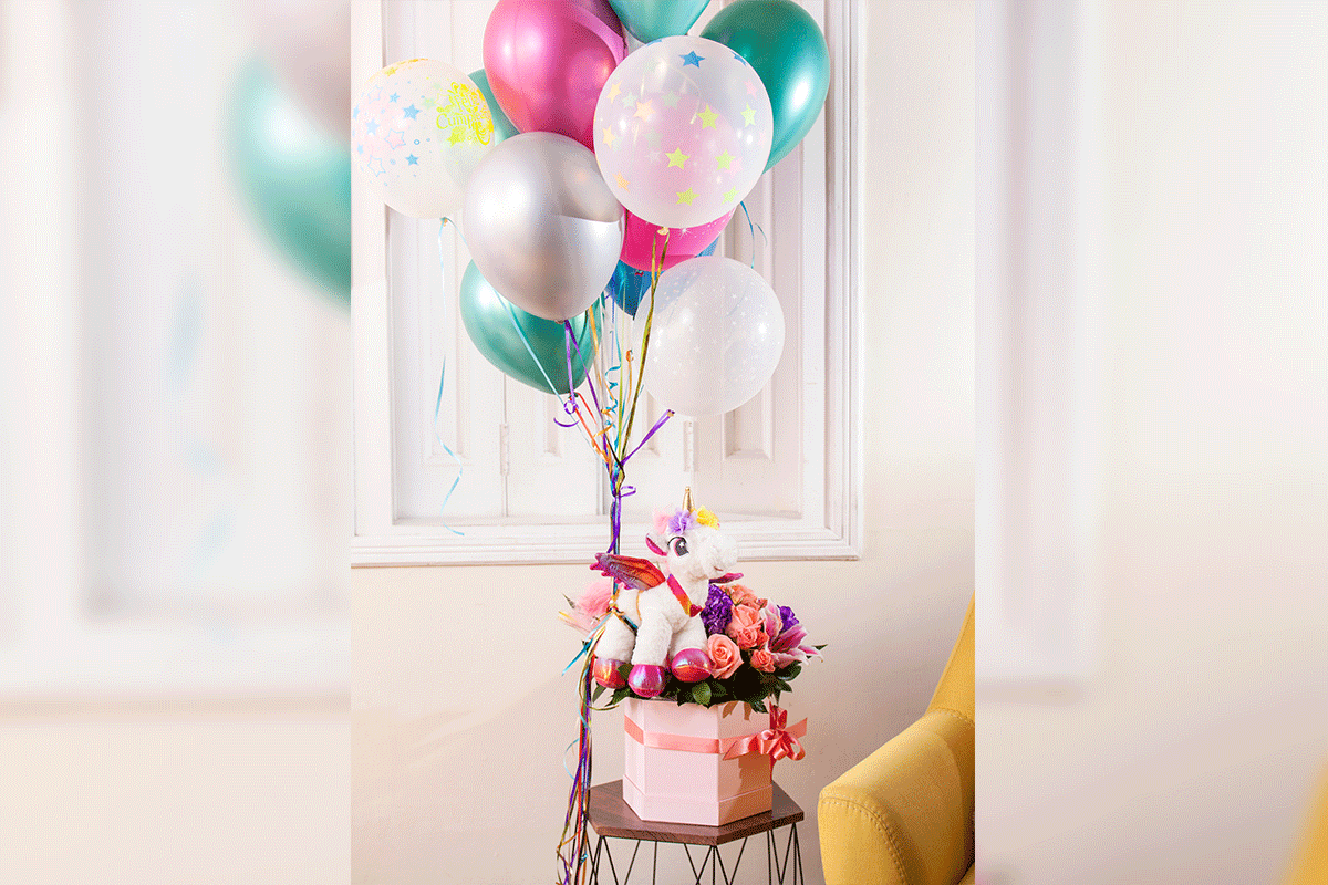 Beautiful pink hexagonal box with purple hydrangeas, pink roses, lilies, pink spray rose, unicorn (unicorn design varies according to availability), balloon bouquet and card with a message that you can personalize.