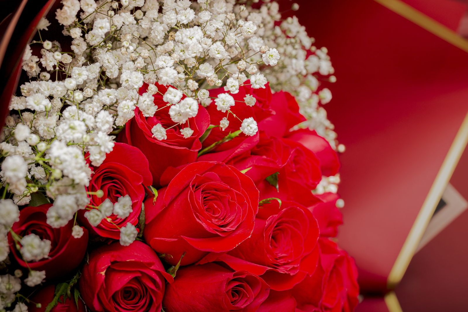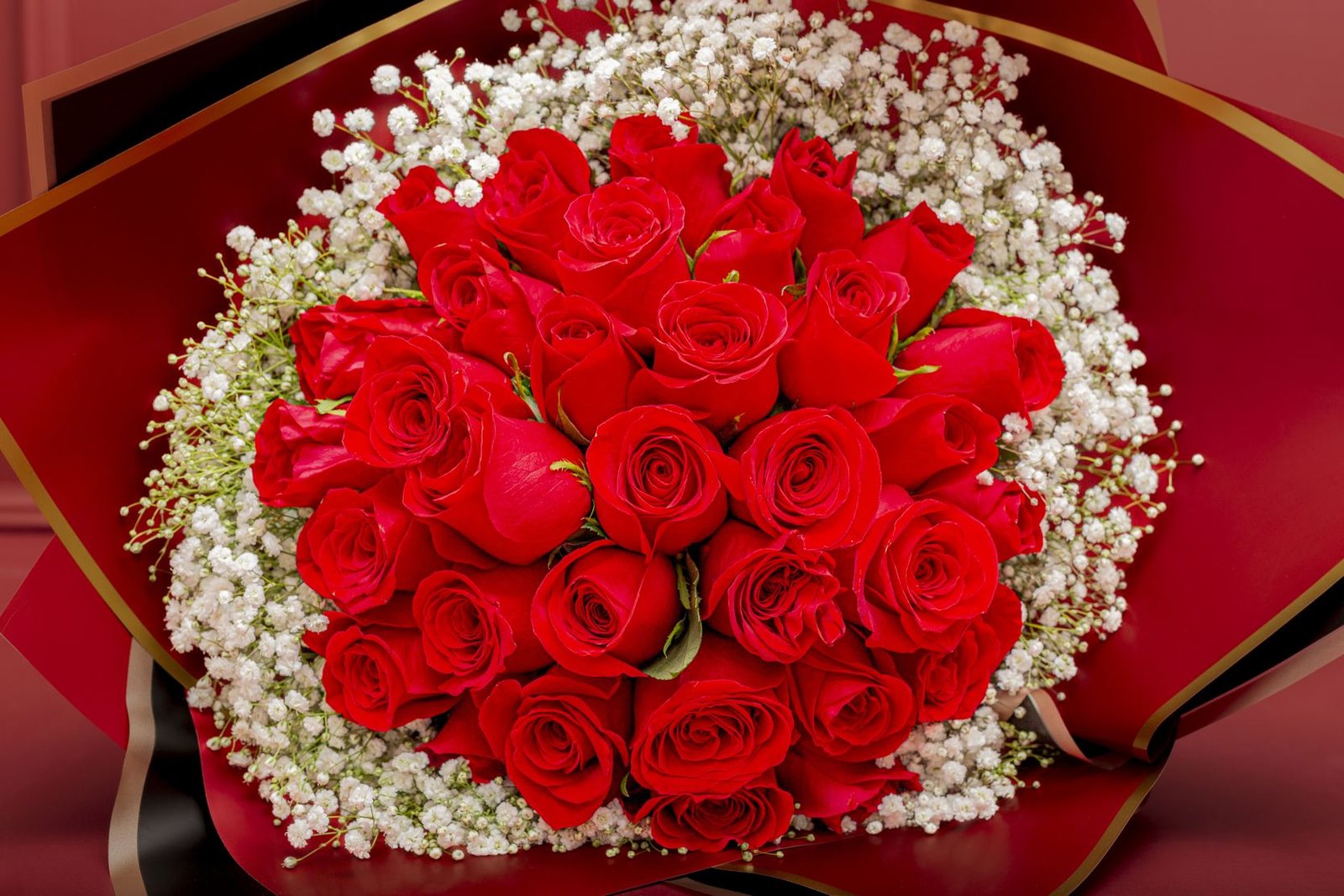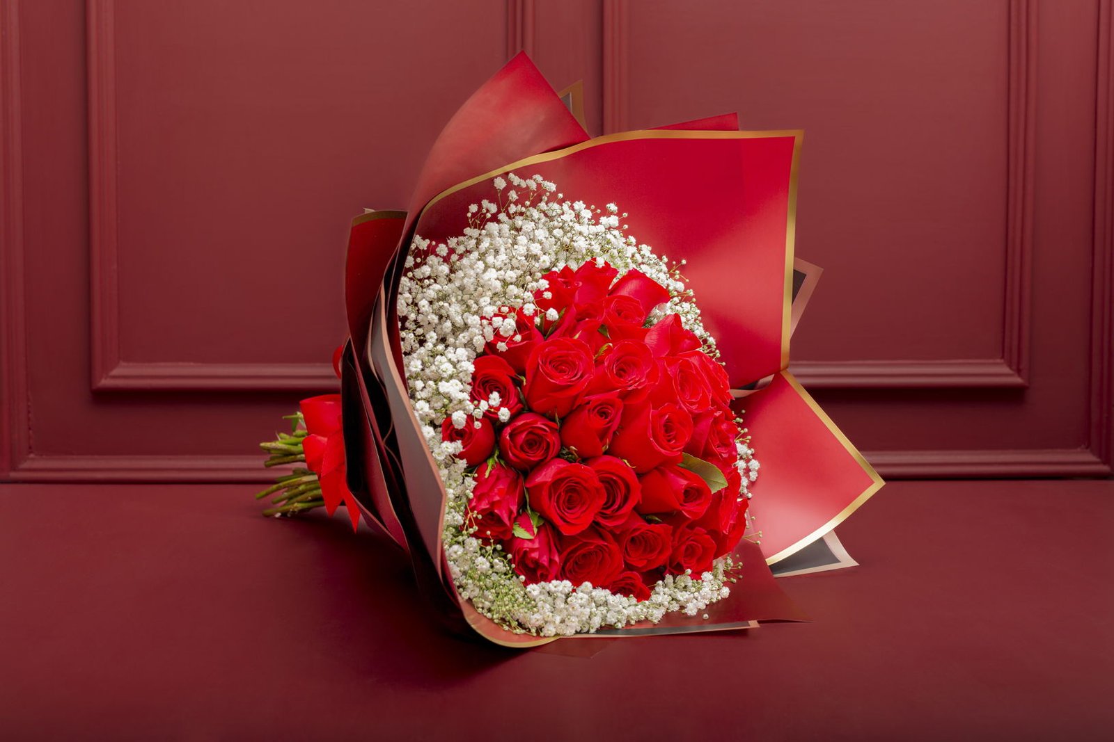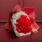 A bouquet of 36 premium red roses, a combination of elegance, accompanied by gypsophila. Wrapped in imported paper and a beautiful ribbon, the perfect gift to surprise. Includes a personalized message and a card with the care of the floral arrangement.