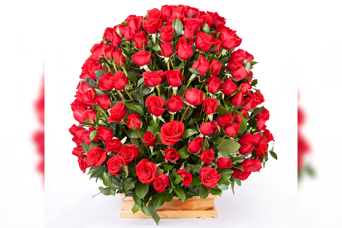 Semi-round floral arrangement on a wooden base of 100 red roses with seasonal foliage and a card with a message that you can personalize.