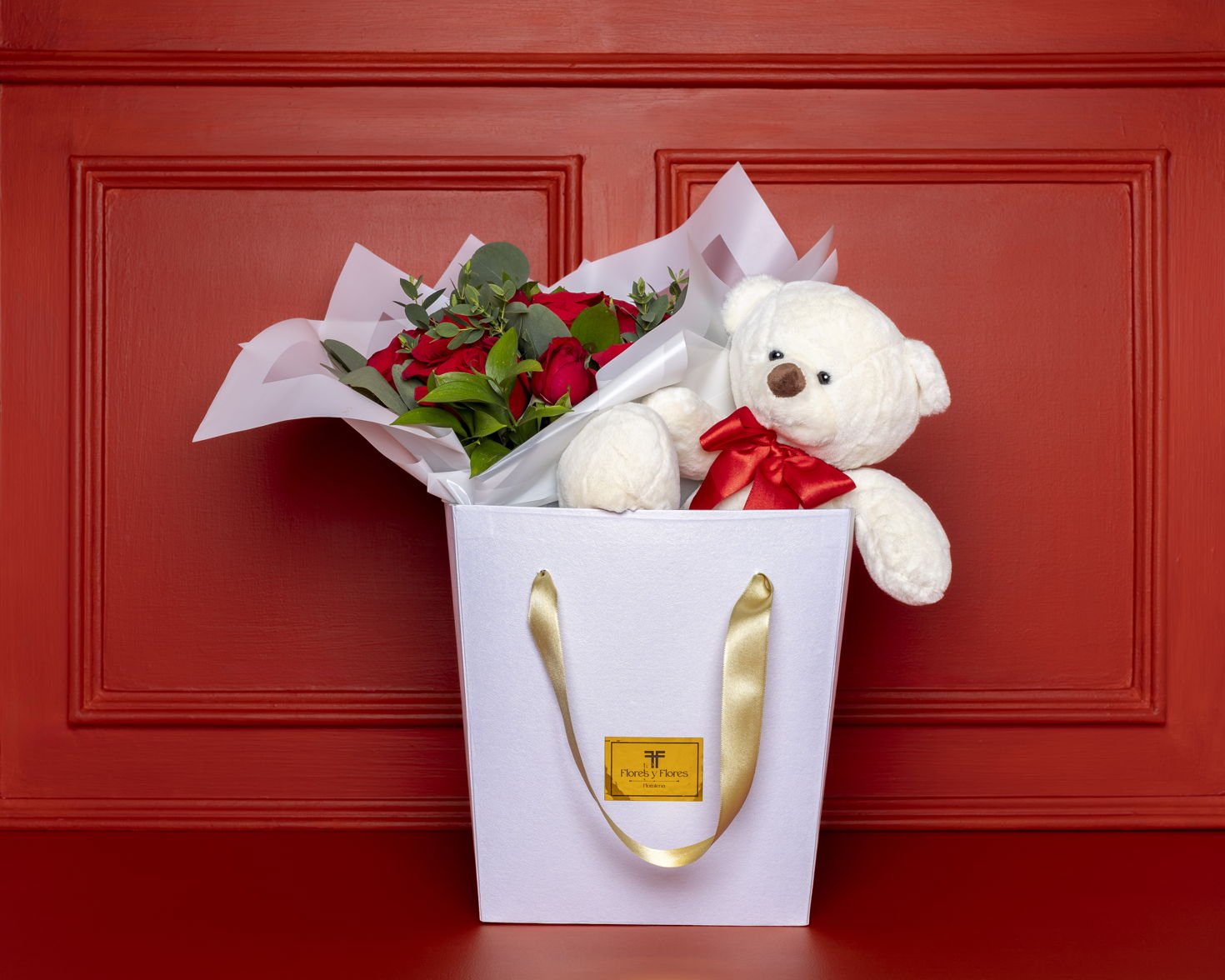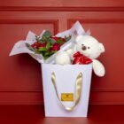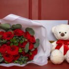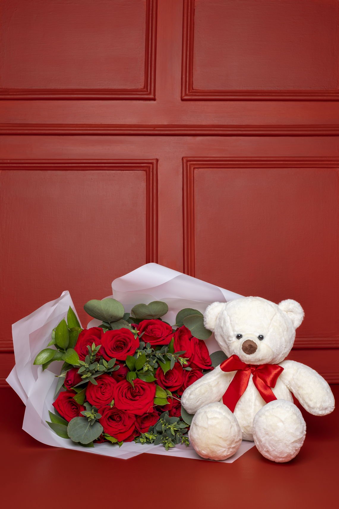 A delicate and romantic floral design. Soft Love features 24 premium red roses, wrapped in imported paper that enhances the richness and elegance of the bouquet. It includes a romantic teddy bear with ribbon (bear design and color may vary depending on availability).
