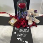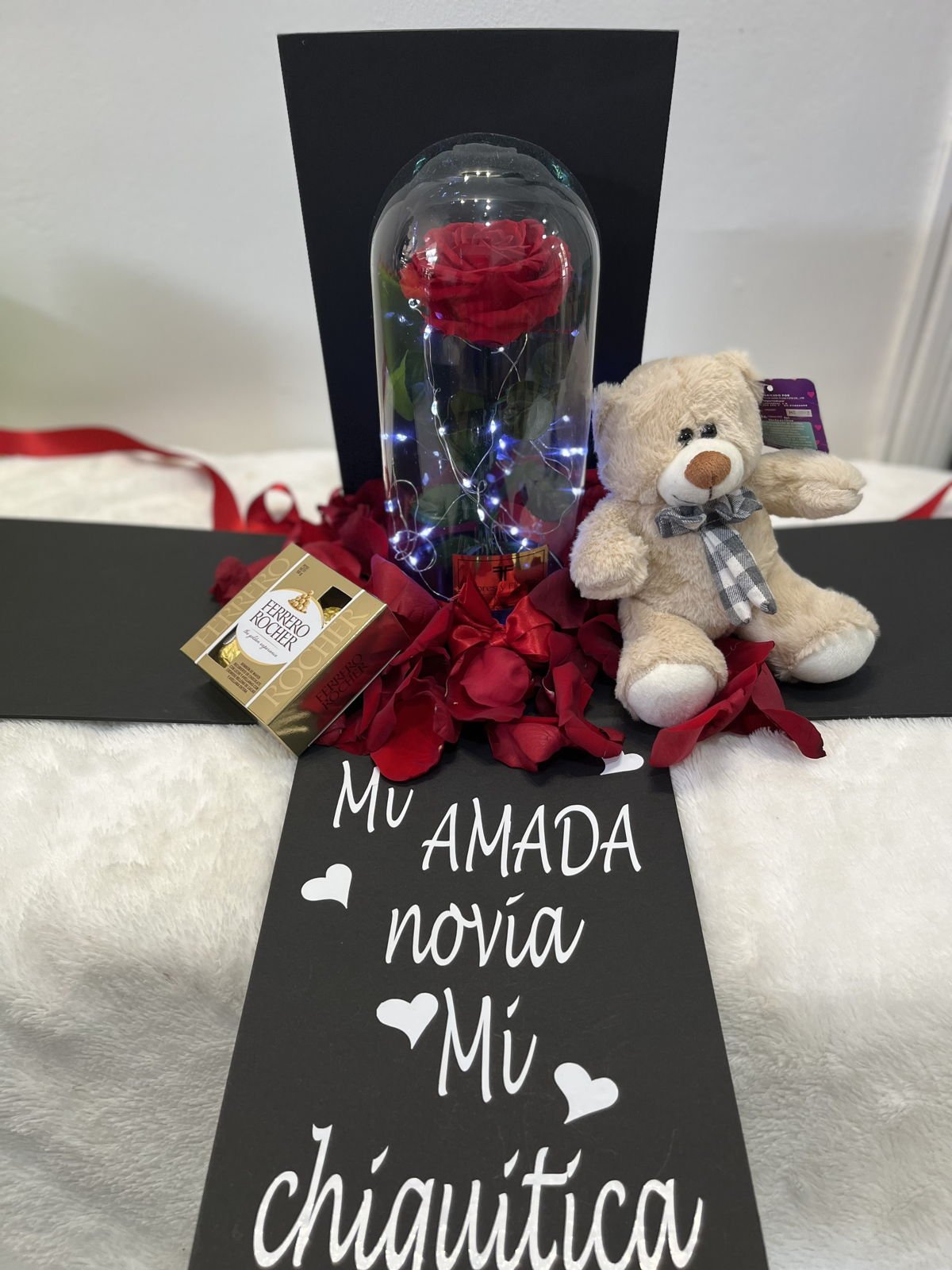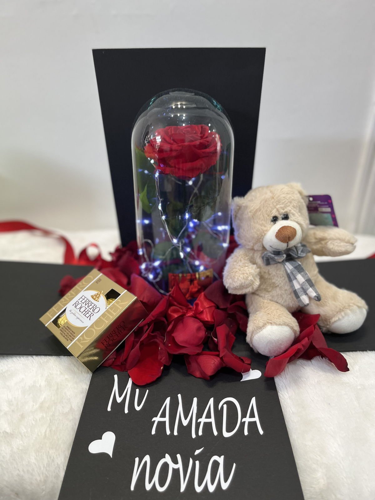 Hermosa rosa preservada en urna de cristal, con luces led y pétalos de rosas naturales, caja de lujo con mensaje personalizado, con hermoso osito de 20 cm (Diseño del oso sujeto a disponibilidad) ferrero por 4 y tarjeta con mensaje que puedes personalizar.
