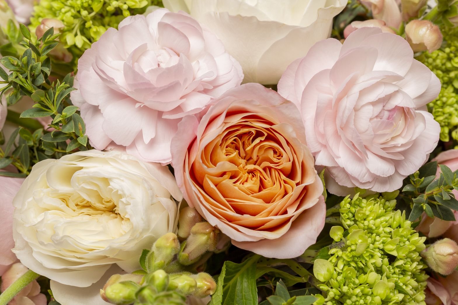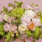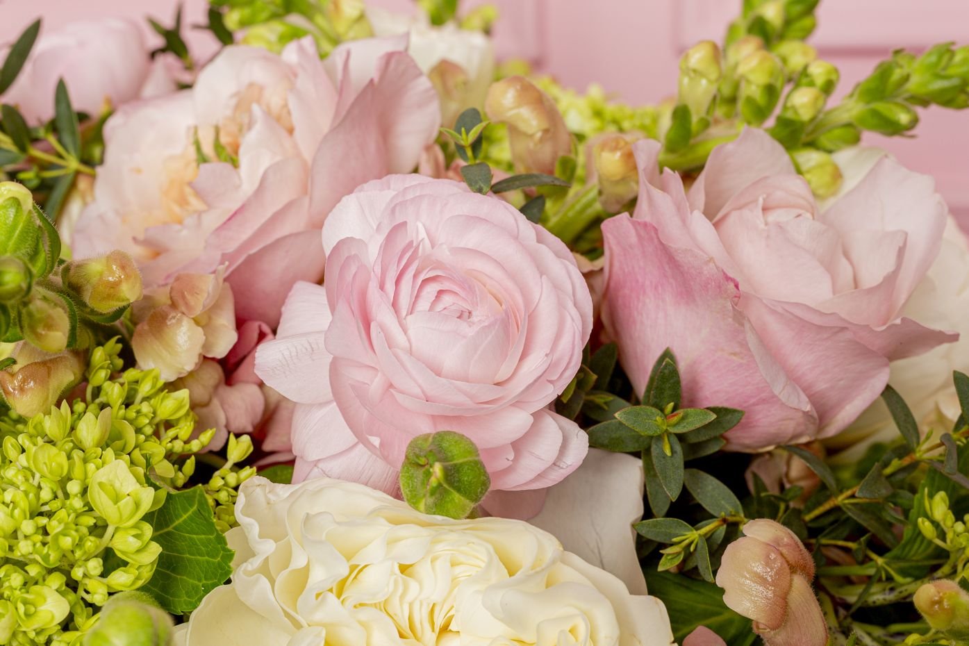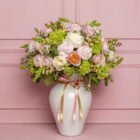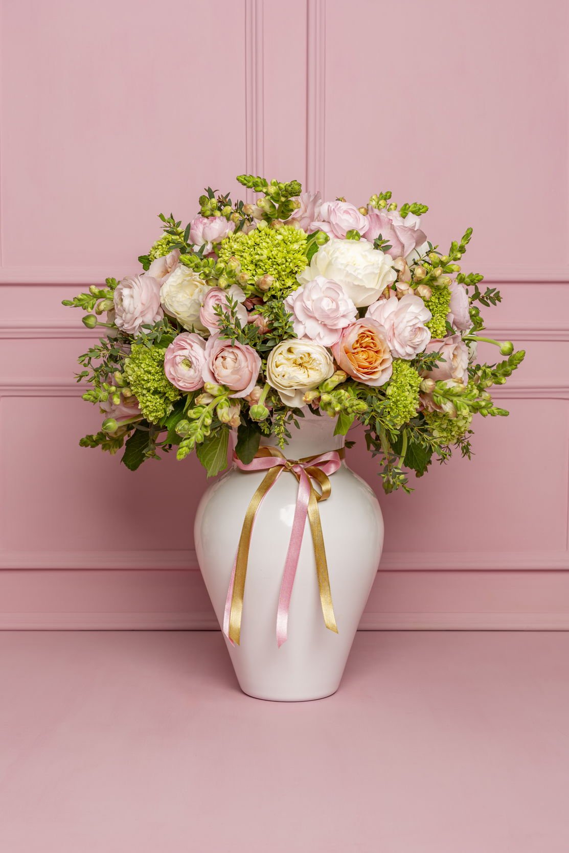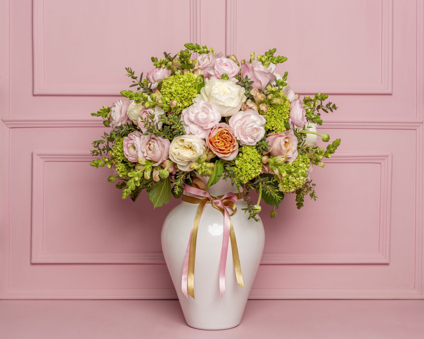 A beautiful oversized floral design that radiates elegance and presence. Composed of blush and peach roses, cream and pink ranunculus, soft lisianthus, and wild textured green foliage, arranged in a white vase with a glossy finish with satin ribbons that enhance its sophistication. Bloom Royale is perfect for spacious spaces and unforgettable moments, where natural luxury takes center stage. The flowers in this collection are natural and unique. Therefore, the shades and varieties may vary depending on availability. We always take care that the design retains its essence, quality, and style.