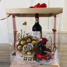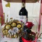 Hermosa caja de acetato, con mensaje personalizado, incluye viruta, chocolates Ferrero de corazón, vino gato negro de 750 ml y mini rosa preservada, el color de la rosa lo puedes escoger entre rosado, rojo, azul, blanco, incluye mensaje personalizado.