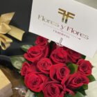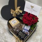 A heart-shaped box with a red rose arrangement, a small box of cookies, a mug appropriate for the occasion, LED lights, and a card with the message of your choice.