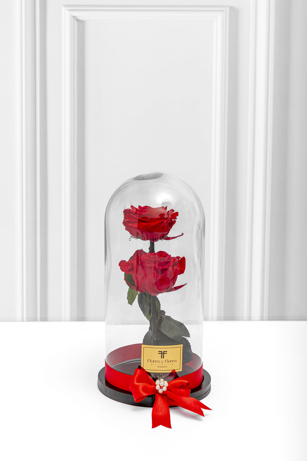A duo of premium preserved roses. Beautifully presented in a large glass urn, with a wooden base and a bow with a fabric ribbon and pearls. They last for over two years. You can choose the color of the rose. Includes a card with a message and care instructions.