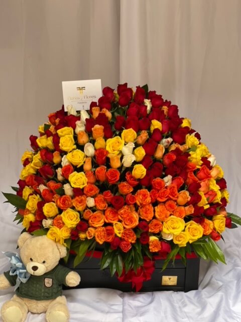Beautiful arrangement of 400 export quality roses in assorted colors, on a luxury base with seasonal foliage, plus a teddy bear (Bear design subject to availability).
