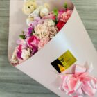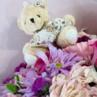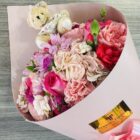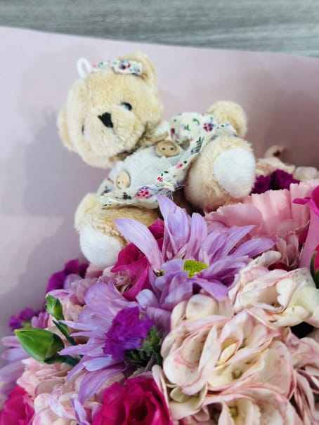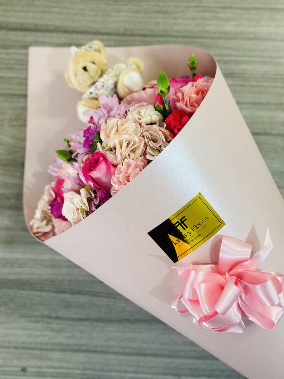 Beautiful light pink cone with pink flowers, such as hydrangeas, star of Bethlehem, roses and carnations, with a teddy bear (Bear design subject to availability), includes a card with a personalized message.