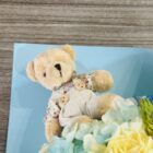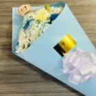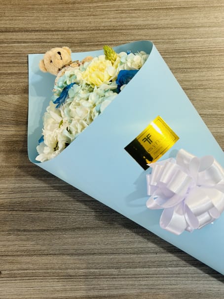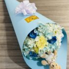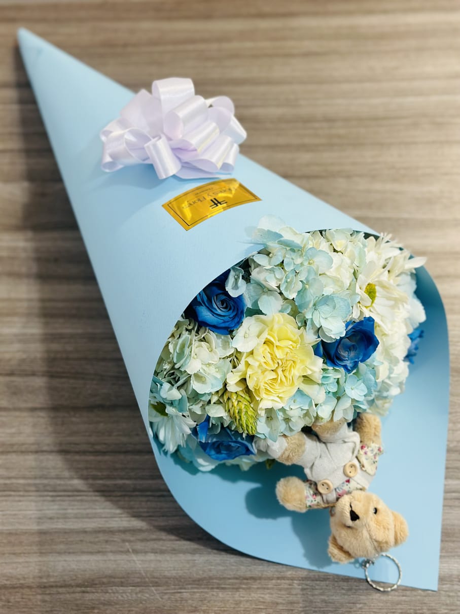 Beautiful light blue cone with blue flowers, such as hydrangeas, star of Bethlehem, roses and carnations, with a teddy bear (Bear design subject to availability), includes a card with a personalized message.